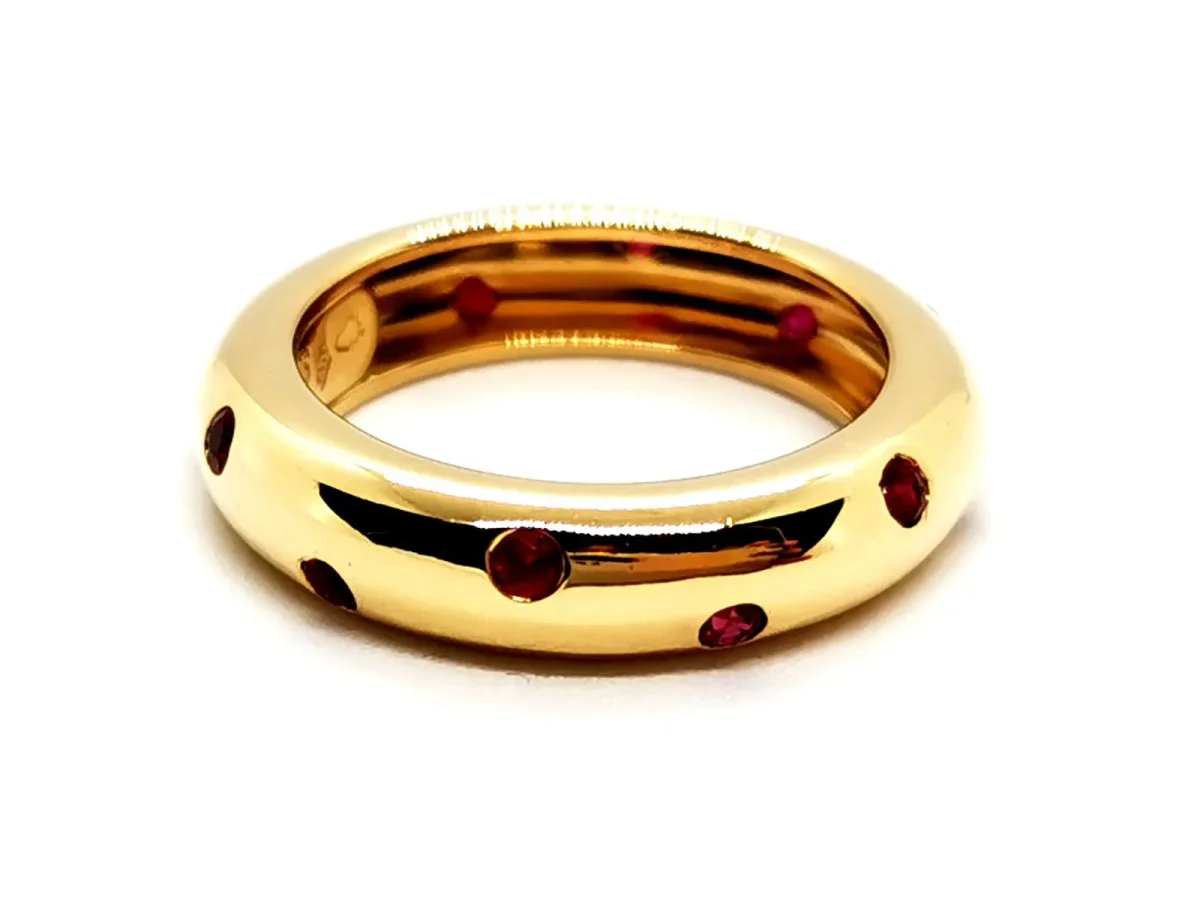 Bague signée de la maison Chaumet, modéle jonc constellation, en or jaune 750 millièmes (18 carats), sertie de 12 rubis ronds, d’environ 0,01 ct chacun, ppids total rubis: environ 0,12 ct, taille: 51, largeur: 0,48 cm, poids total: 6,05 g, poinçon tête d’aigle, signée et numérotée: 321877, excellent état