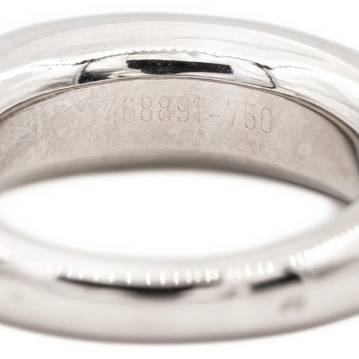 Bague jonc signée Chaumet, en or blanc 750 millièmes (18 carats), tour de doigt: 53, largeur sur le dessus: 0,69 cm, poids total: 8,48 g, poinçon tête d’aigle, prix neuf: 3200€, numéroté: 468891, excellent état
