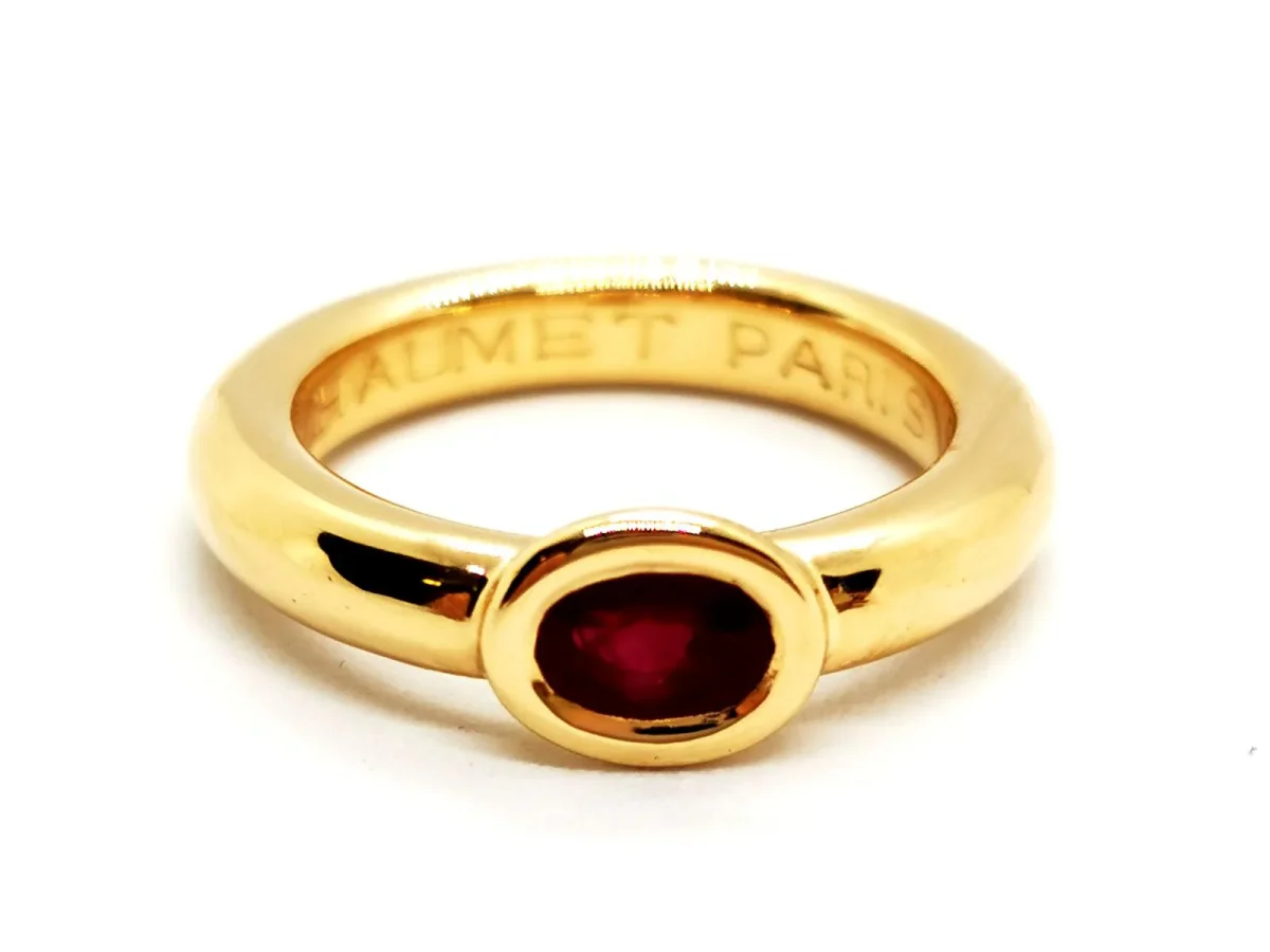 Bague signée de la maison Chaumet, en or jaune 750 millièmes (18 carats), jonc massif, serti d’un rubis ovale d’environ 0,47 ct, tour de doigt: 52, largeur sur le dessus: 0,66 cm, signé Chaumet Paris, numéroté: 174339, poids total: 8,33 g, poinçon tête d’aigle, excellent état