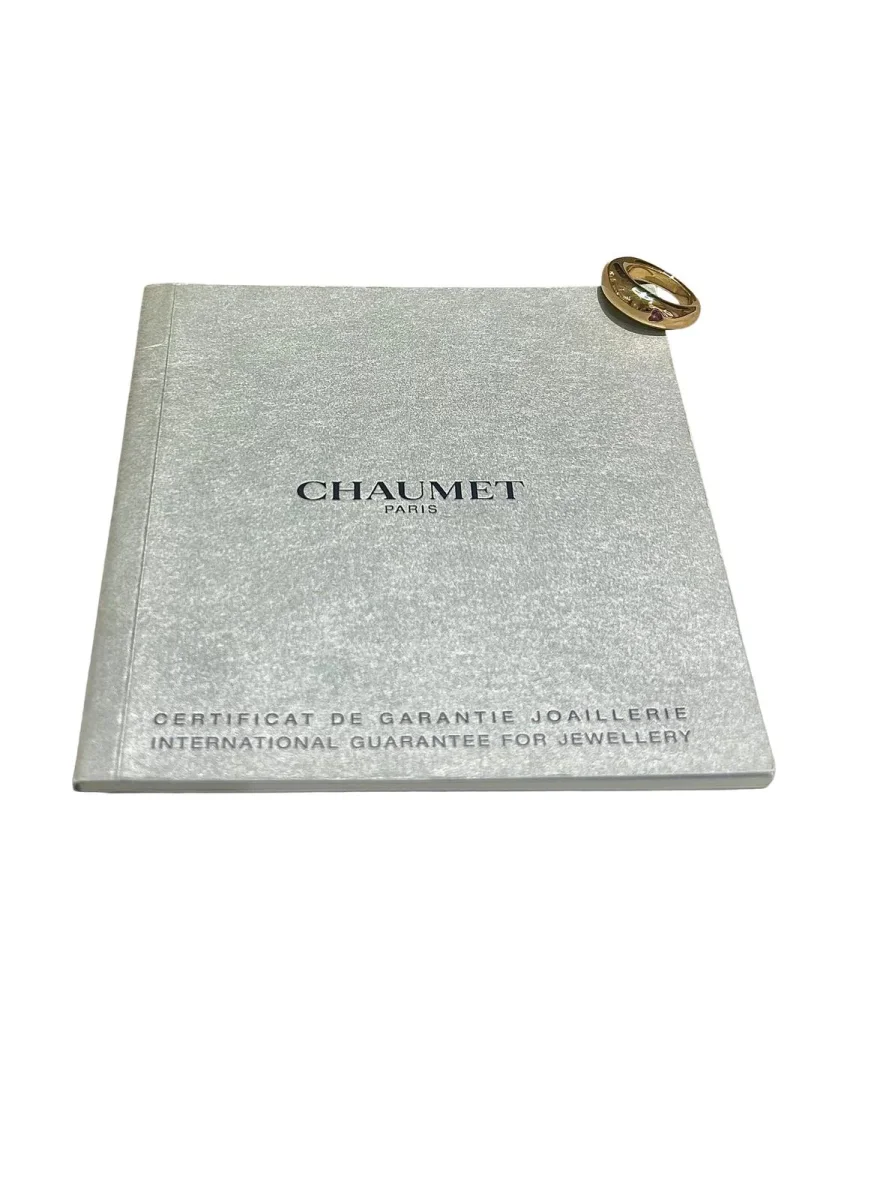Bague jonc signée de la Maison Chaumet en or jaune 750 millièmes (18K) testé, sertie d’un saphir, taille coeur, d’un poids total d’environ 0,10 ct, largeur sur le dessus : 0,72 cm, tour de doigt : 49, poids total : 8,27 g, numérotée : 617075, vendue avec certificat d’origine, excellent état