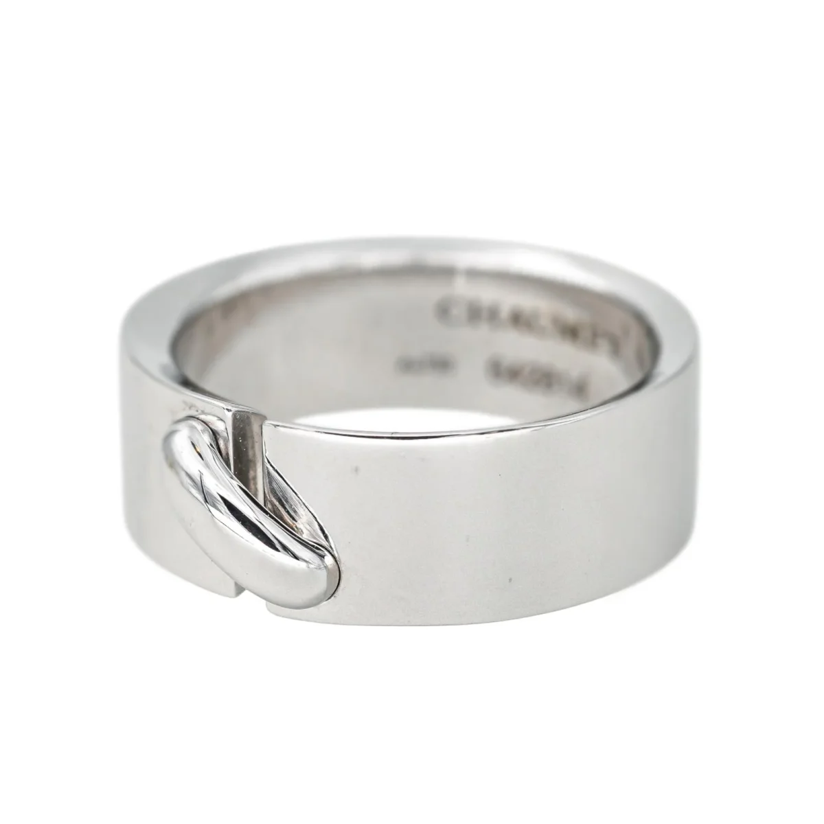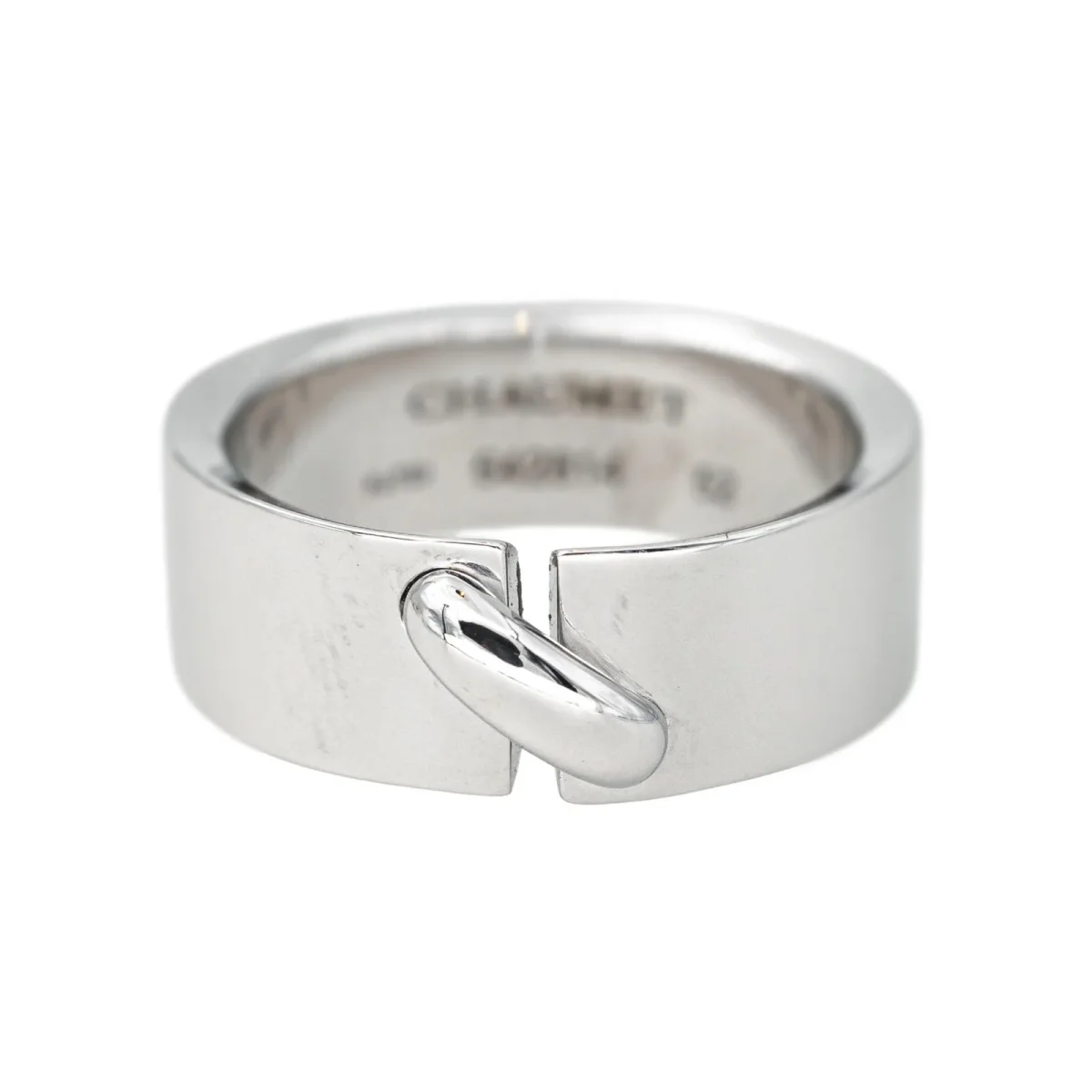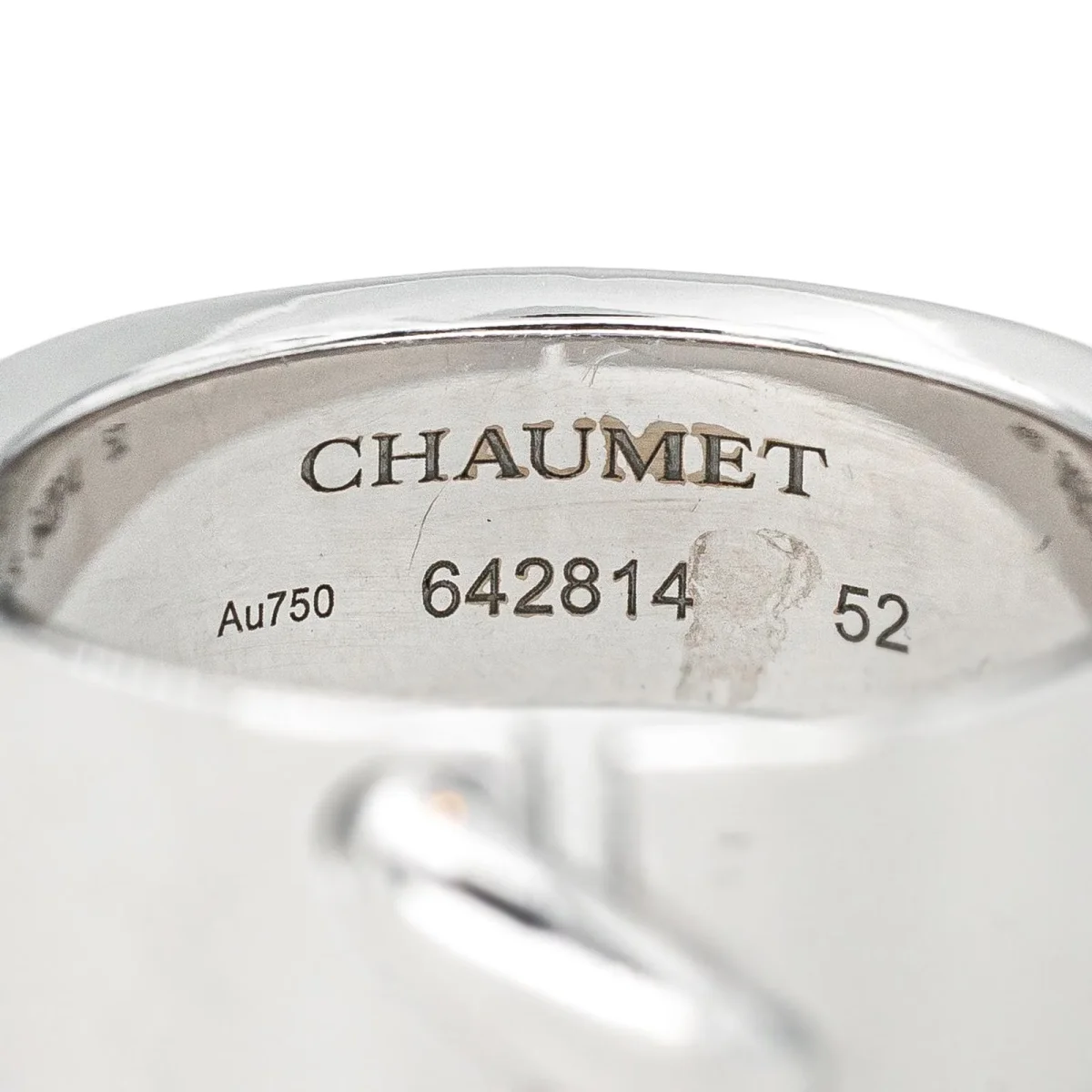 Bague signée de la Maison Chaumet en or blanc 750 millièmes (18 carats), modèle Lien, largeur sur le dessus : 0,70 cm, tour de doigt : 52, poids total : 10,07 g, poinçon tête d’aigle, vendue avec écrin d’origine et d’époque, numérotée : 4660882RV, excellent état