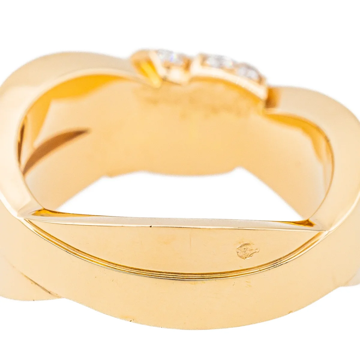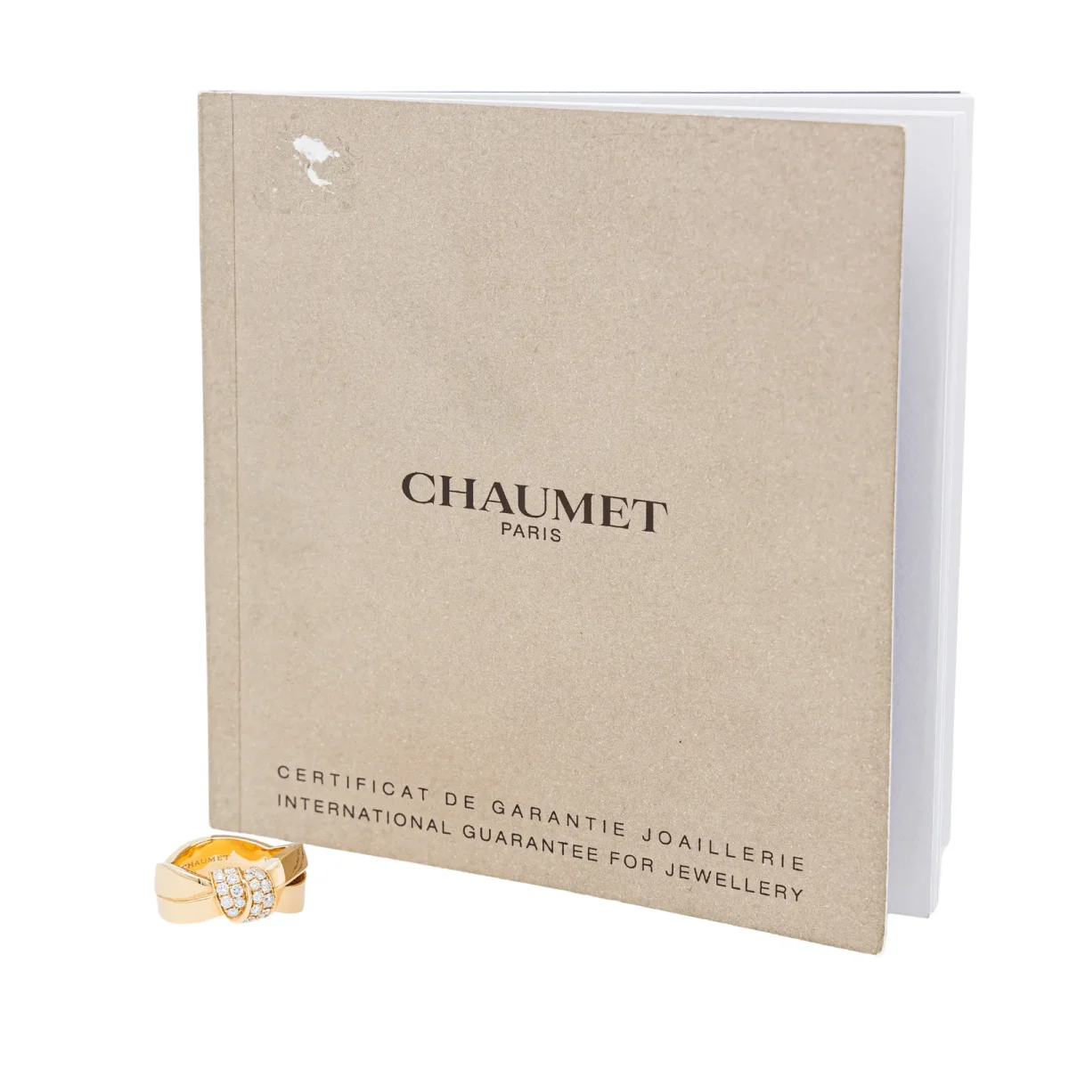 Bague signée de la maison Chaumet, collection Lien séduction GM Noeud, motif lien en noeud, serti de 22 diamants taille brillant G/VVS, pour un total d’environ 0,42 ct, tour de doigt: 53, largeur sur le dessus: 0,8 cm, largeur max coté: 1 cm, signée et numérotée, poids total: 14,97 g, poinçon tête d’aigle, jamais porté, excellent état