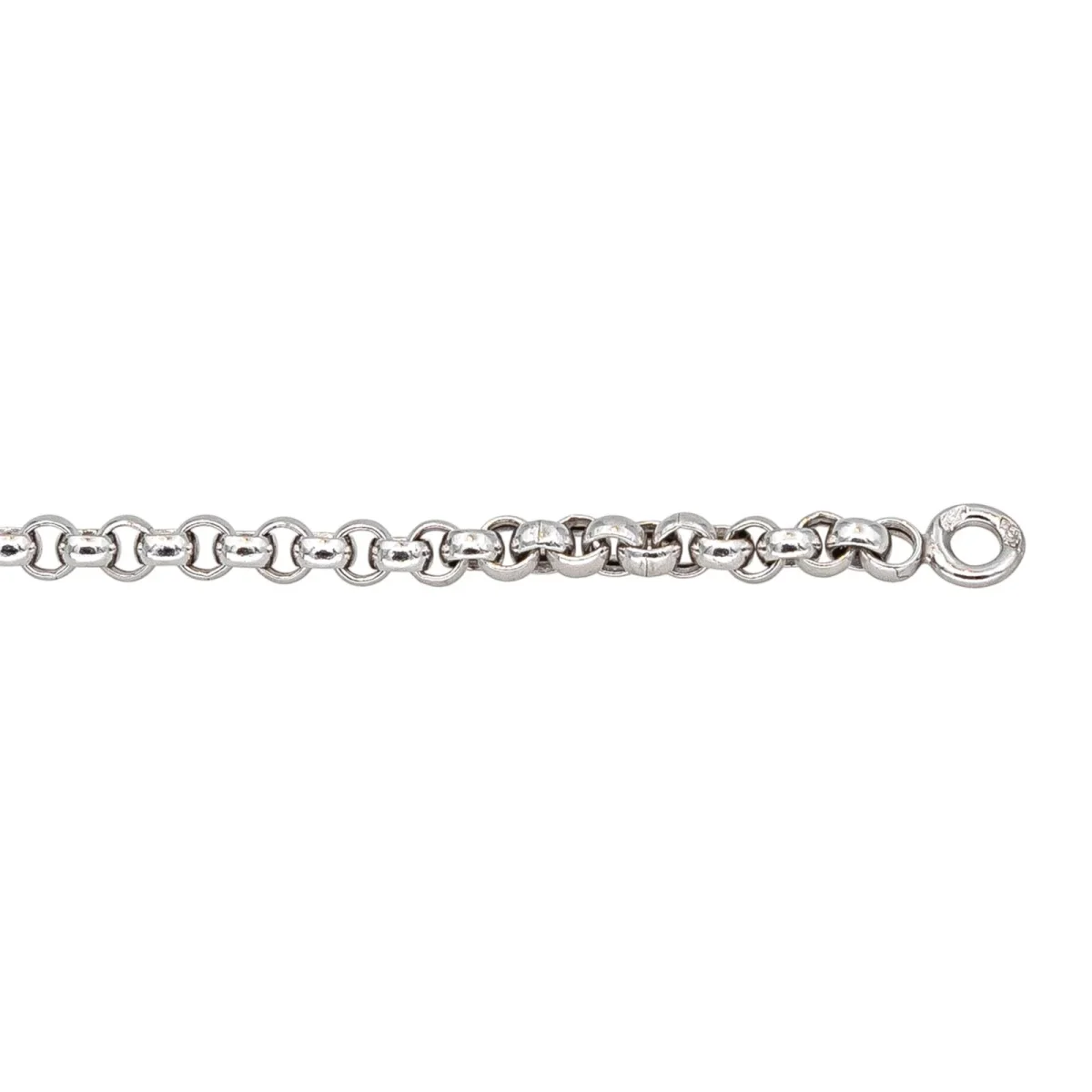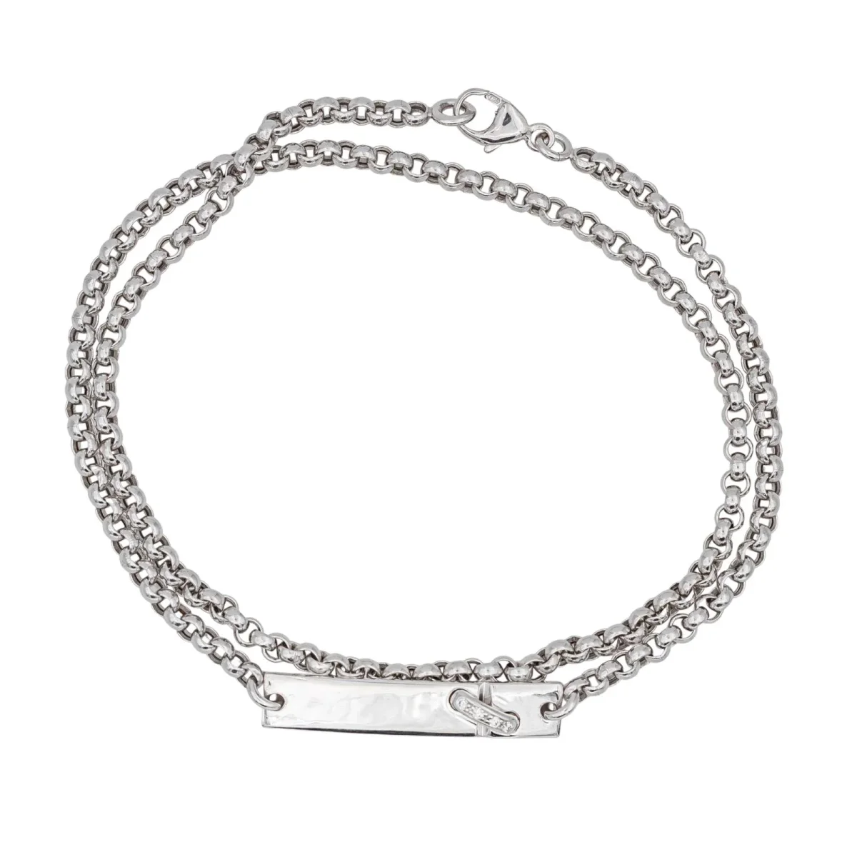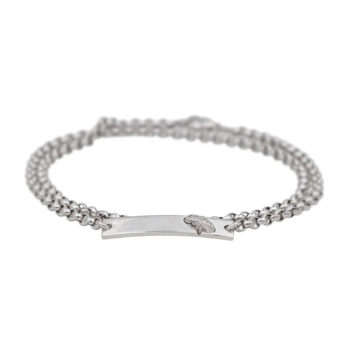 Bracelet signé de la Maison Chaumet en or blanc 750 millièmes (18 carats), modèle Liens évidence, serti de 4 diamants taille brillant, environ G-VS, d’un poids total d’environ 0,01 ct, (chaque diamants d’un poids d’environ 0,004 ct), maille souple, longueur : 32,50 cm, largeur : 0,50 cm, épaisseur : 0,30 cm, poids total : 6,24 g, poinçon tête d’aigle, numéroté : 713282, excellent état