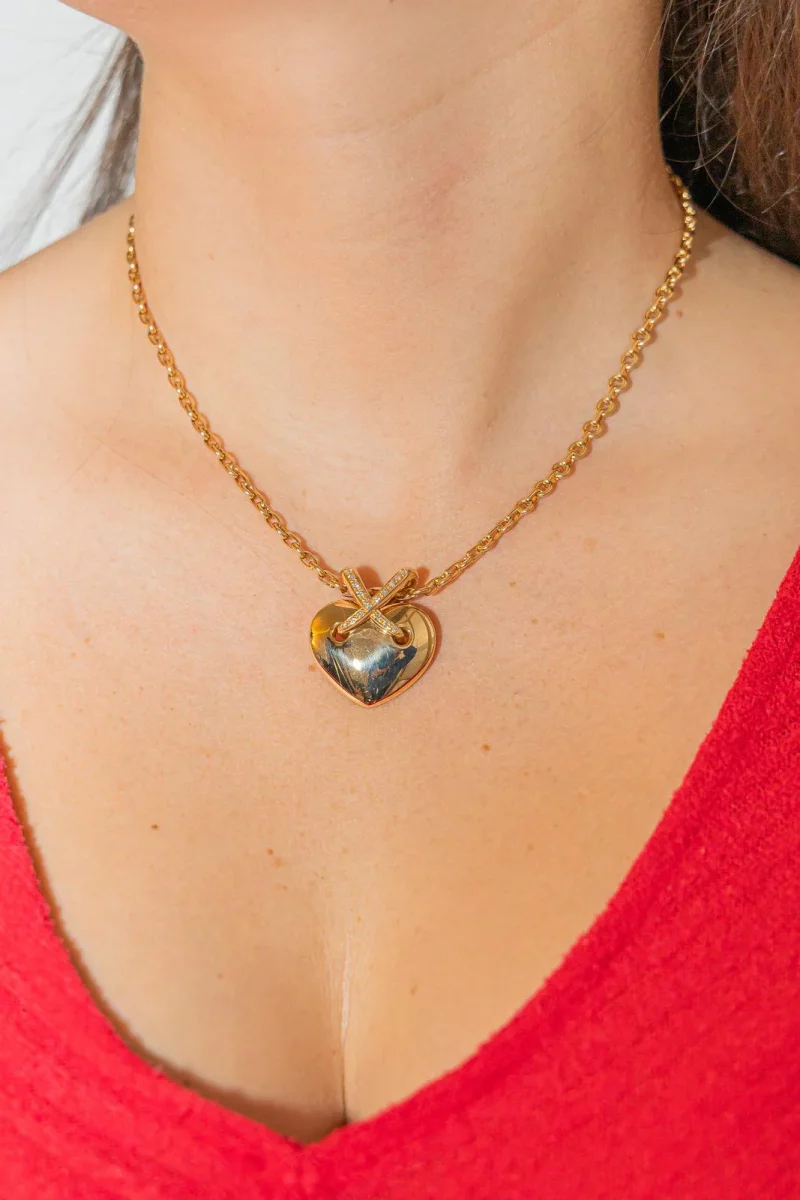 Collier signé de la Maison Chaumet en or jaune 750 millièmes (18 carats), pendentif Liens Cœurs serti de 17 diamants taille brillant estimés H/VS environ 0,01 ct chacun, Poids total estimé des diamants: 0,17 ct, dimensions du pendentif: 2,50 x 2,80 cm, numéroté 370546 et signé, dimensions de la chaine: 45 x 0,43 cm, numérotée 628882 et signée, Poids total: 32,31 g, Poinçon tête d’aigle, Excellent état
