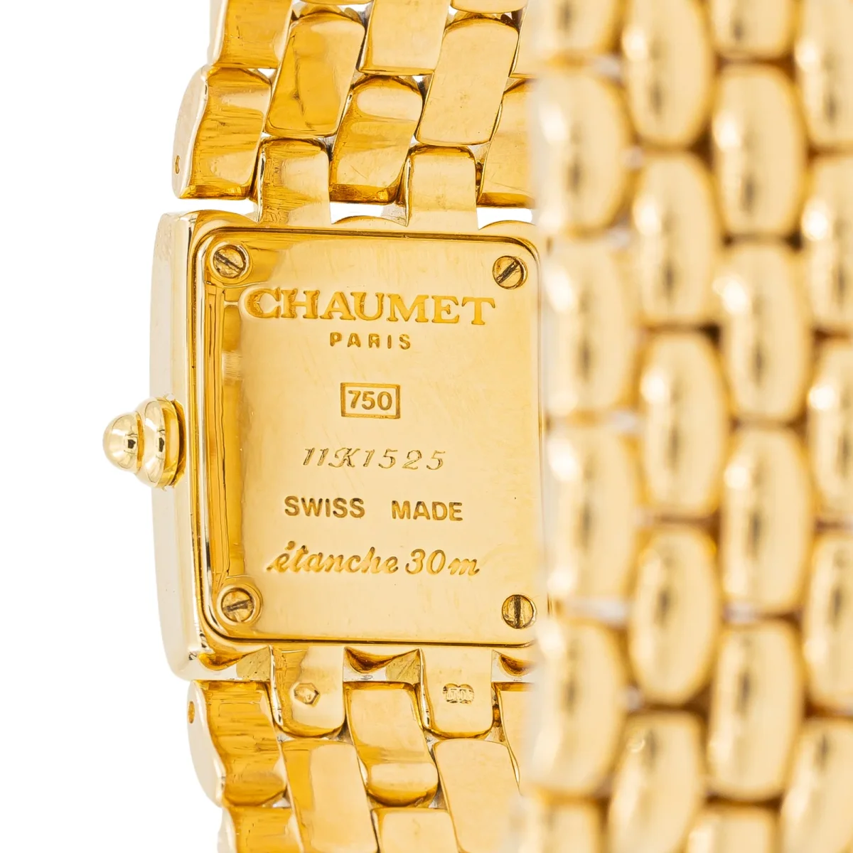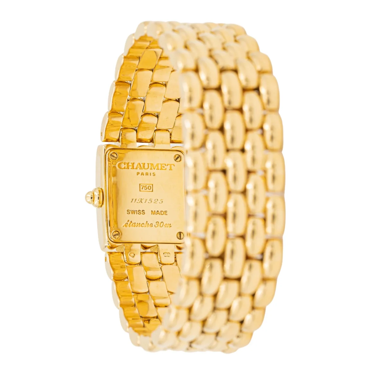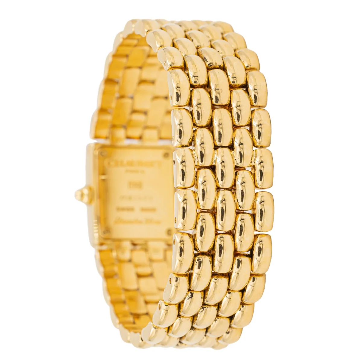 Montre signée de la Maison Chaumet, modèle « Khésis », en or jaune 750 millièmes (18 carats), mouvement quartz, cadran ivoir, index en diamants, dimensions cadran: 1,3 cm x 1,0 cm, bracelet maille grain de riz, largeur du bracelet: 1,7 cm, tour de poignet: 16 cm, boucle déployante en or rose 750 millièmes (18 carats), numérotée : 11K1525, poids total: 89,37 g, poinçon saint Bernard, excellent état
