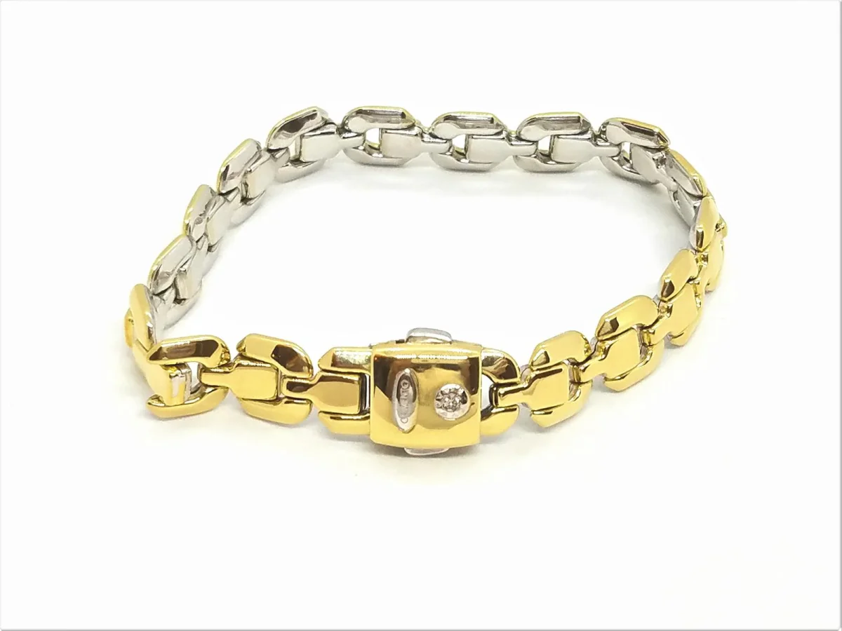 Bracelet signé de la maison Chimento, en or 750 millièmes (18 carats) , bicolore, une face en or jaune et verso en or blanc, serti sur le fermoir d’un diamant taille brillant G-VS d’environ 0,01 ct, longueur: 21 cm, largeur: 1,04 cm, poids total: 23,06 g, poinçonné, excellent état