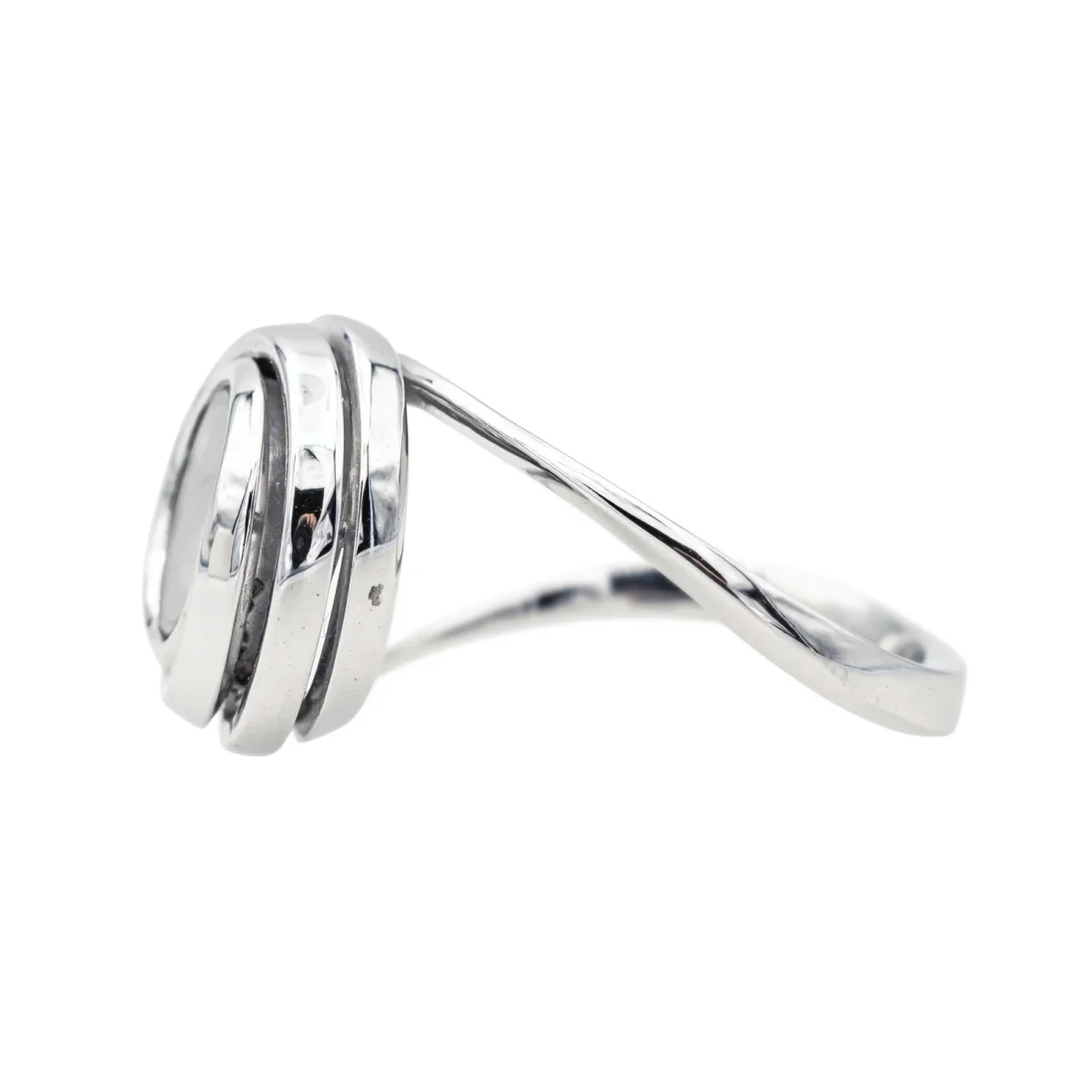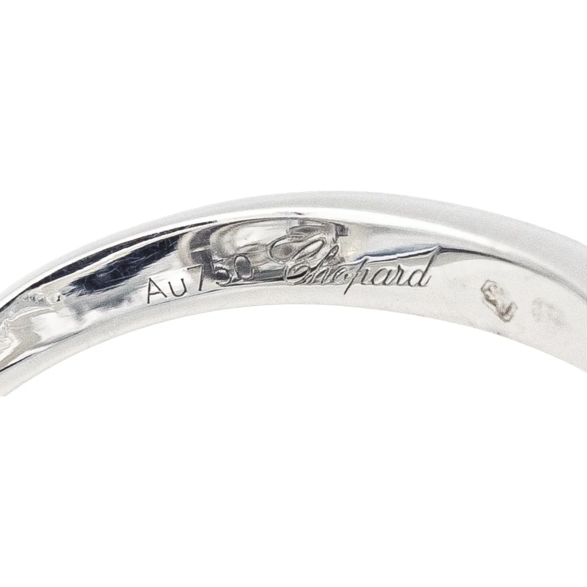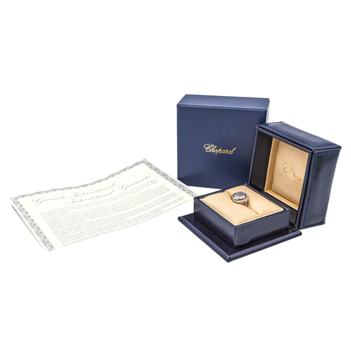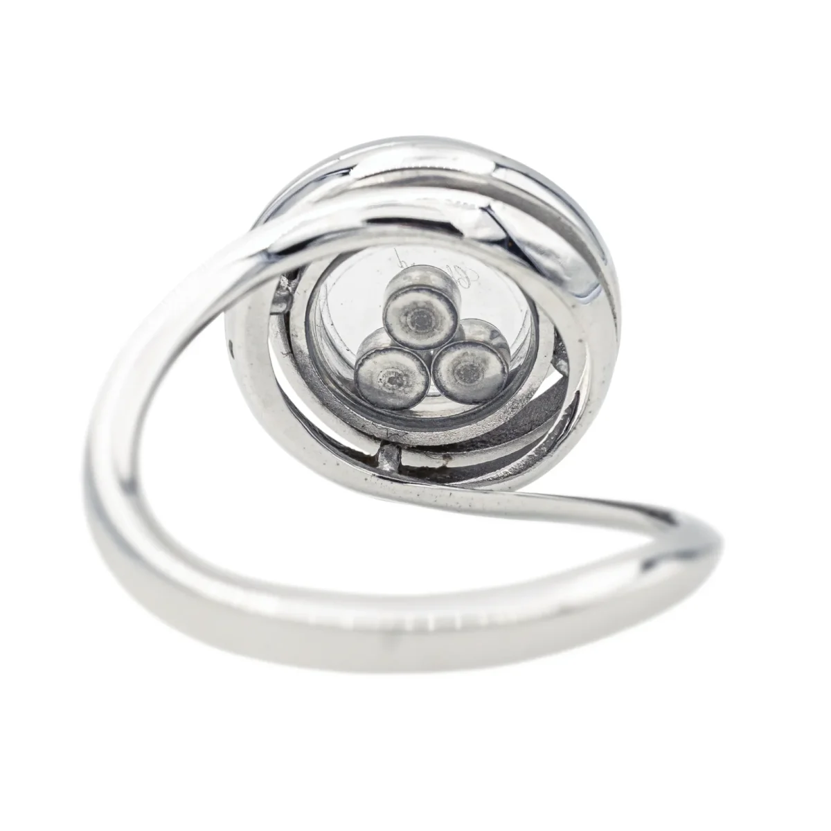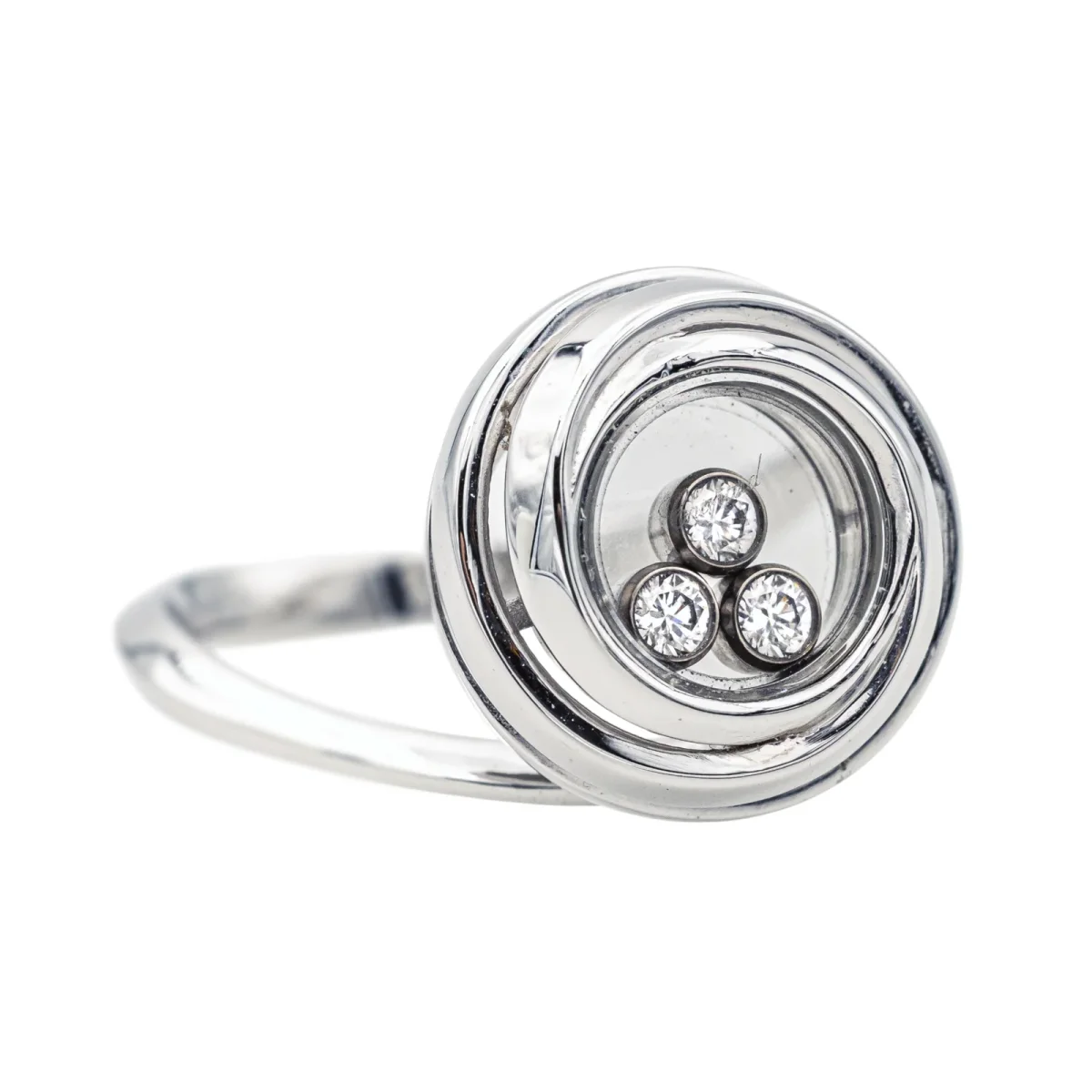 Bague signée de la Maison Chopard en or blanc 750 millièmes (18 carats), modèle Happy emotion, 3 diamants taille brillant, environ H-VS, d’un poids total d’environ 0,42 ct, (chaque diamant d’un poids d’environ 0,14 ct), largeur sur le dessus : 1,38 cm, tour de doigt : 55, poids total : 6,43 g, poinçon saint Bernard, vendue avec écrin et certificat d’origine et d’époque, numérotée : 3307494-829216, excellent état