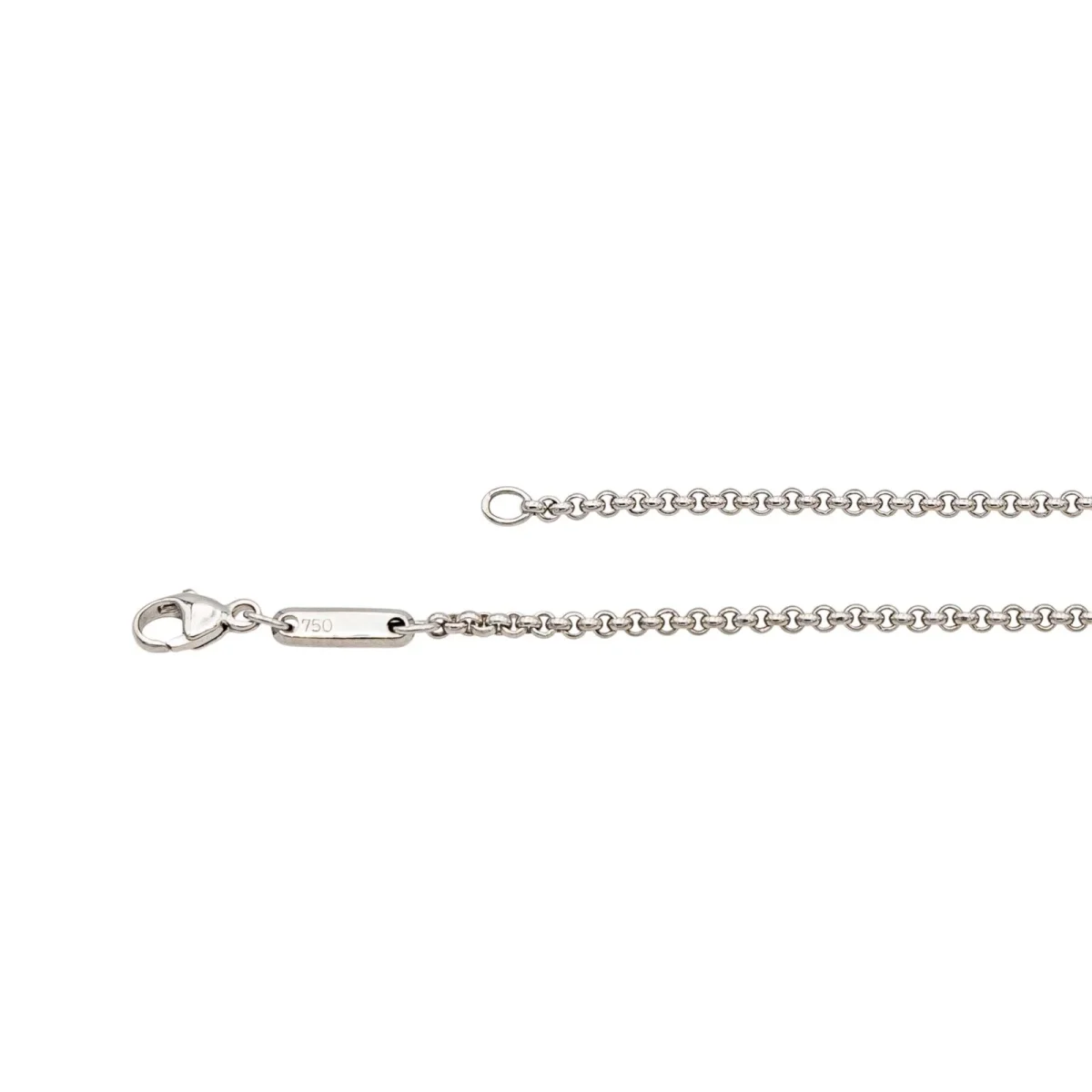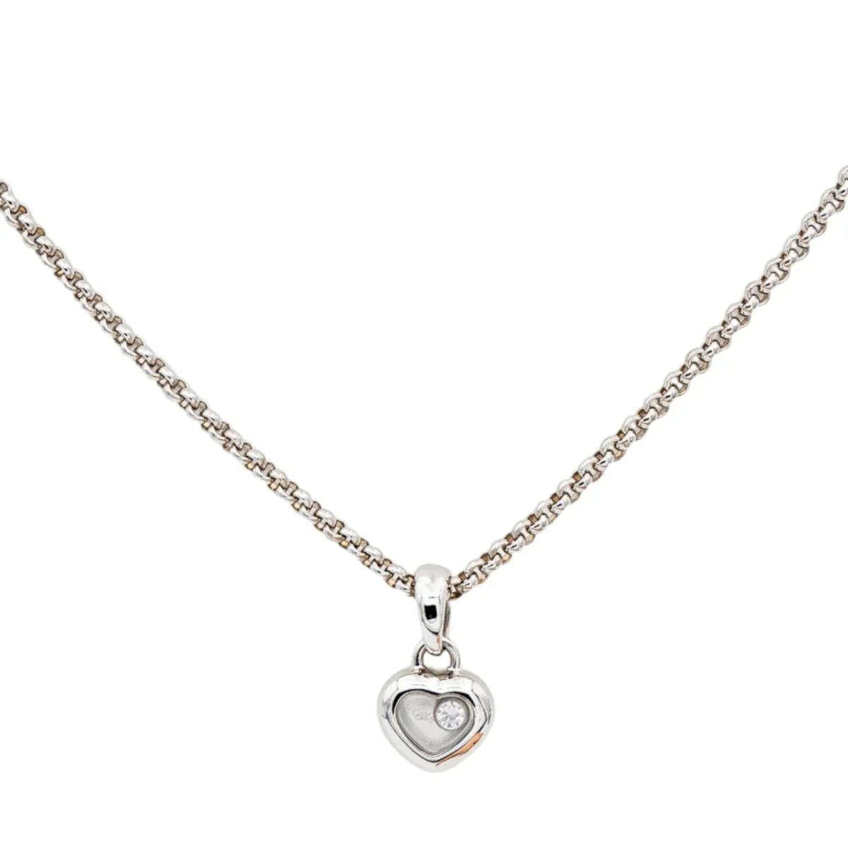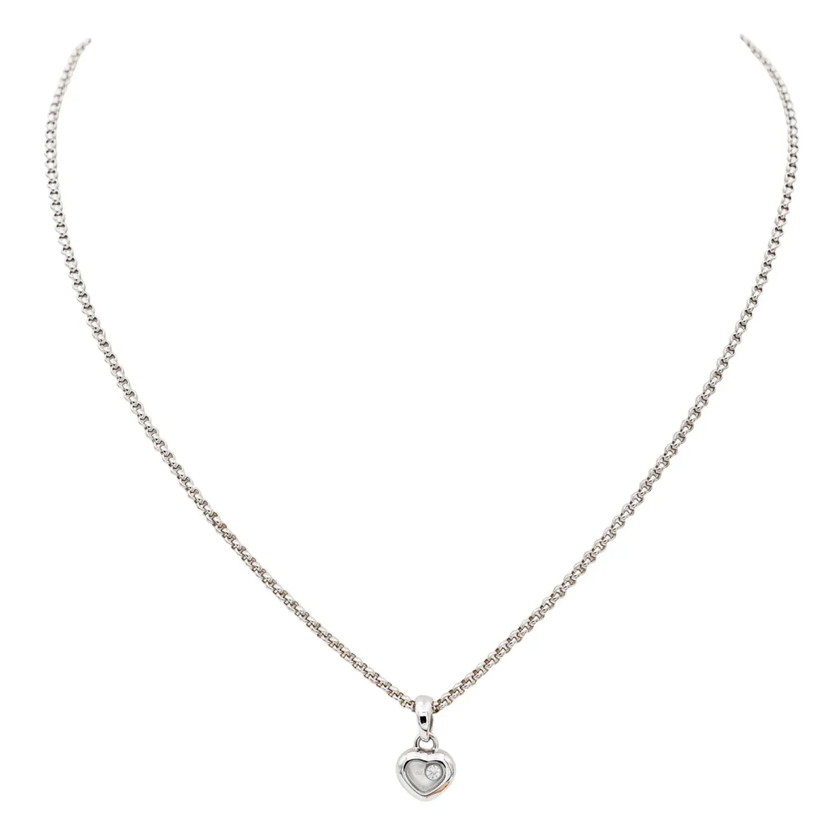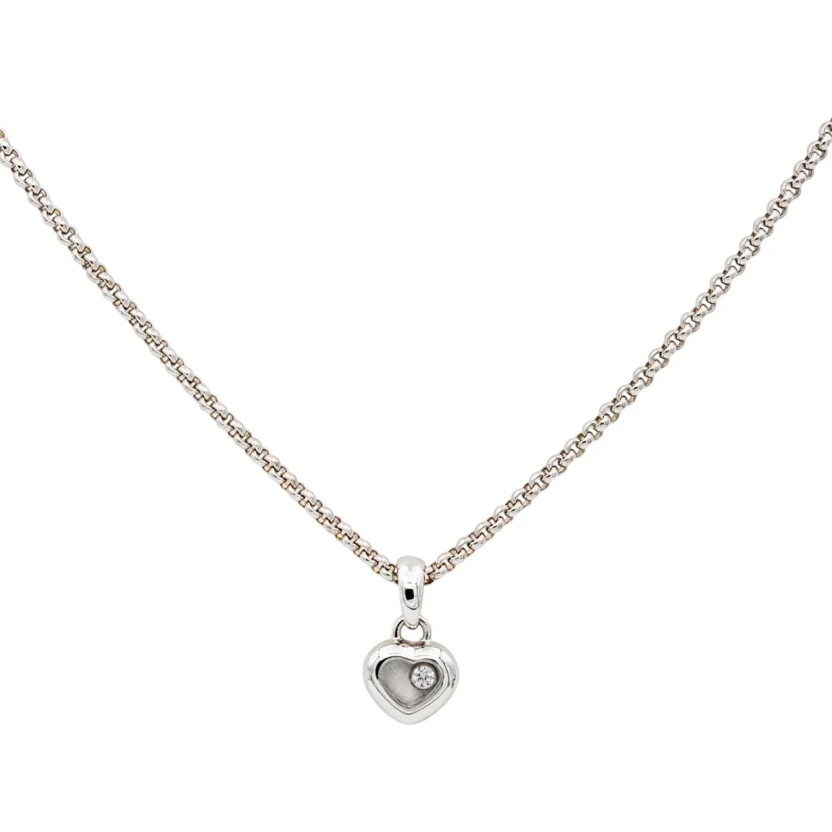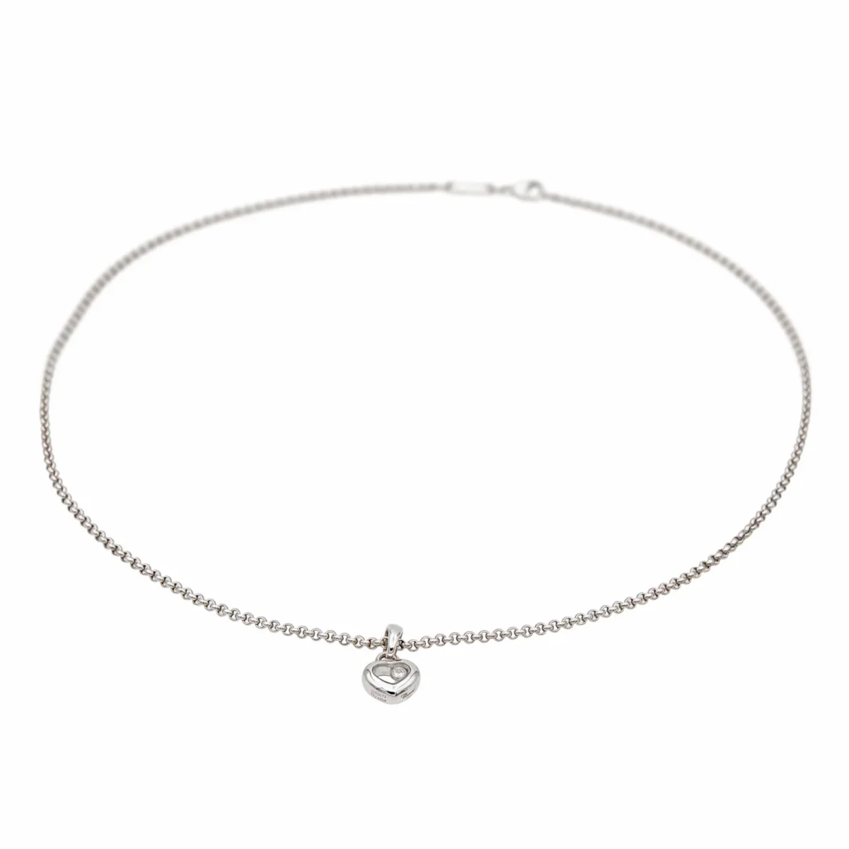 Collier signé et numéroté de la Maison Chopard or blanc 750 millièmes (18 carats), modèle Happy Diamonds, pendentif cœur avec un diamant à l’interieur, 1 diamant environ G-VVS, d’un poids total d’eniron 0,05 ct, maille jaseron, numéro de série : 2299673 79/4854, longueur de la chaine : 42,5 cm, dimensions du pendentif avec bélière: 1,53 cm x 0,90 cm, poids total : 10,90 g, poinçon hibou, excellent état.