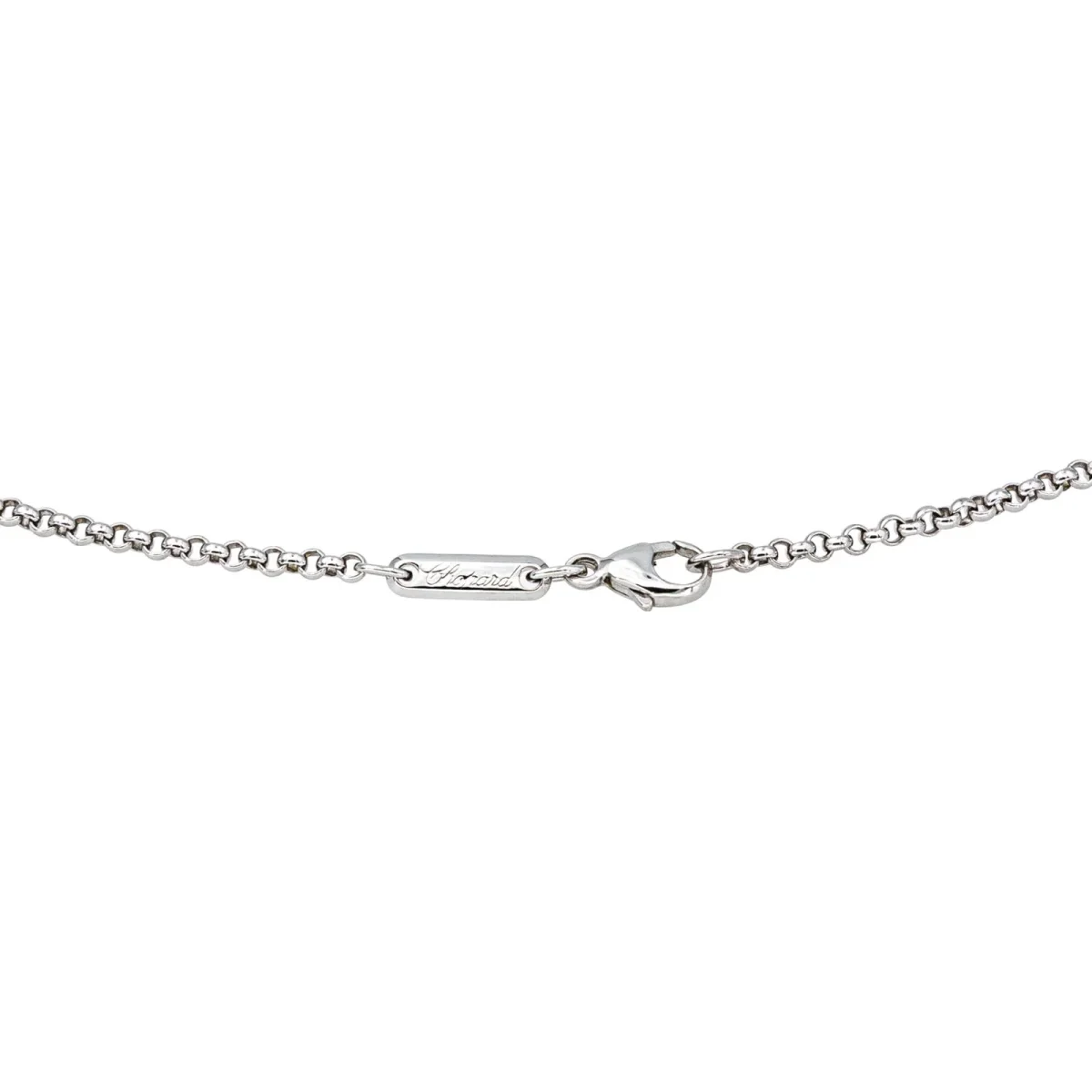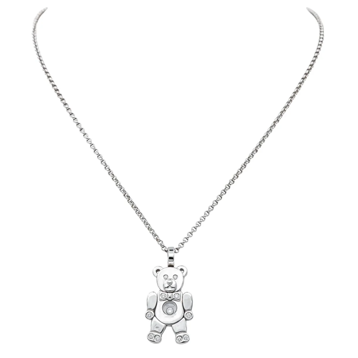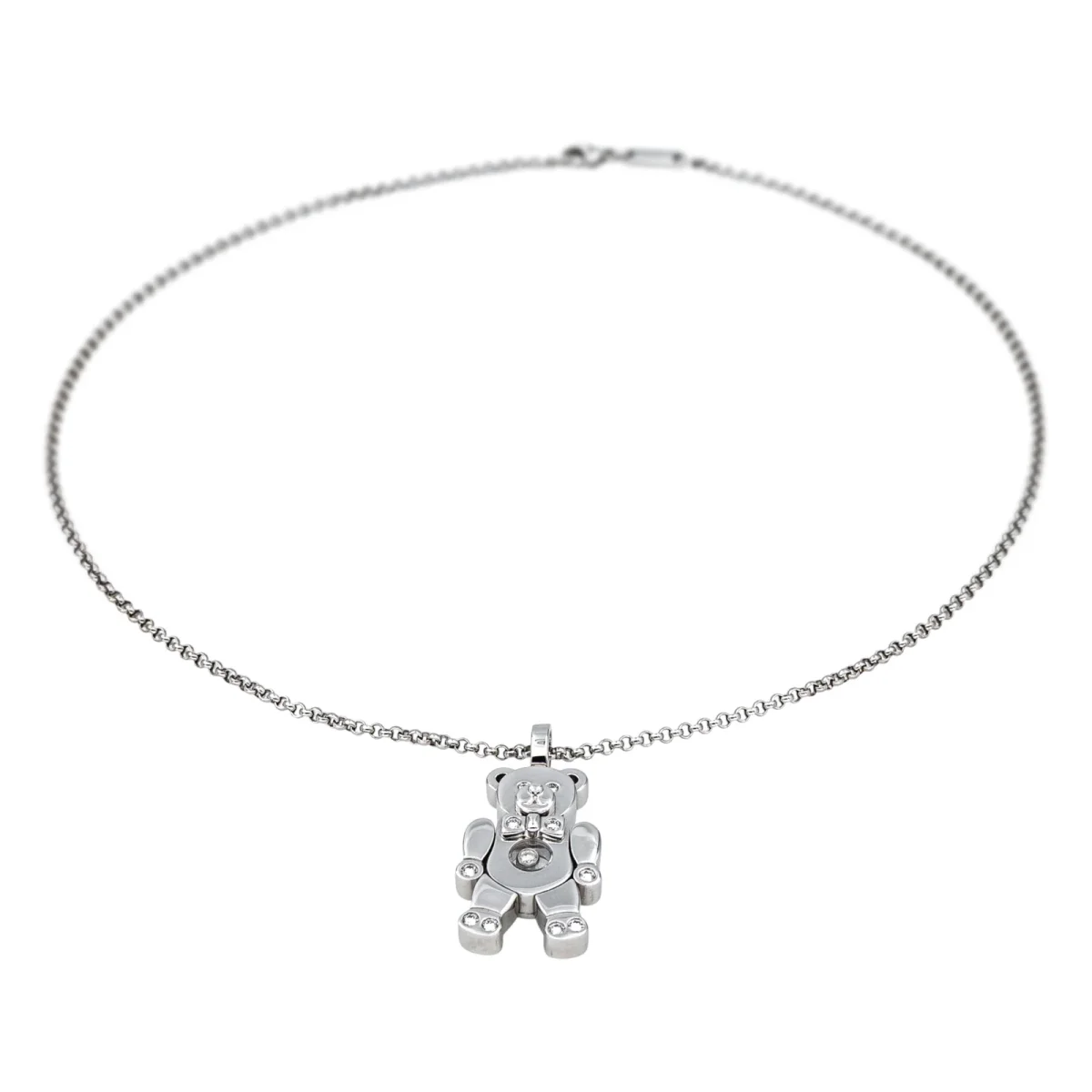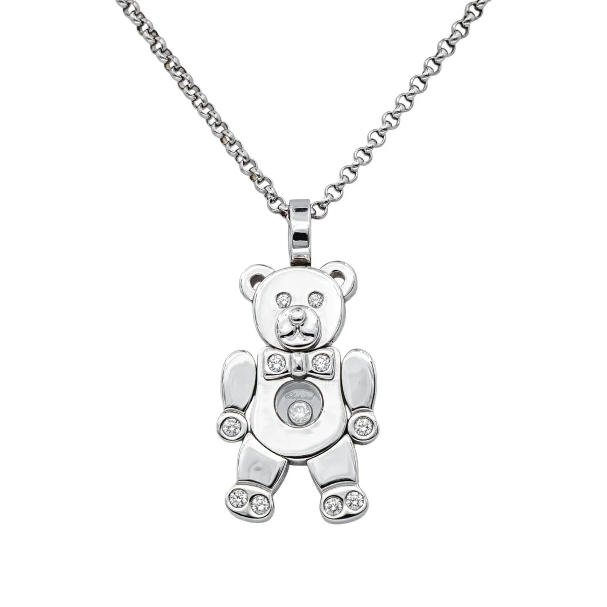 Collier signé de la Maison Chopard en or blanc 750 millièmes (18 carats), modèle Happy Diamond, représentant un ours, sertis de diamants, taille brillant, environ G-VS, d’un poids total d’environ 0,25 ct, maille forçat, longueur : 42,50 cm, largeur de la chaîne : 0,10 cm, longueur de la partie comprenant les motifs : 3,40 cm, largeur : 1,50 cm, poids total : 21,62 g, poinçon tête d’aigle, numéroté : 246127179/3748, excellent état