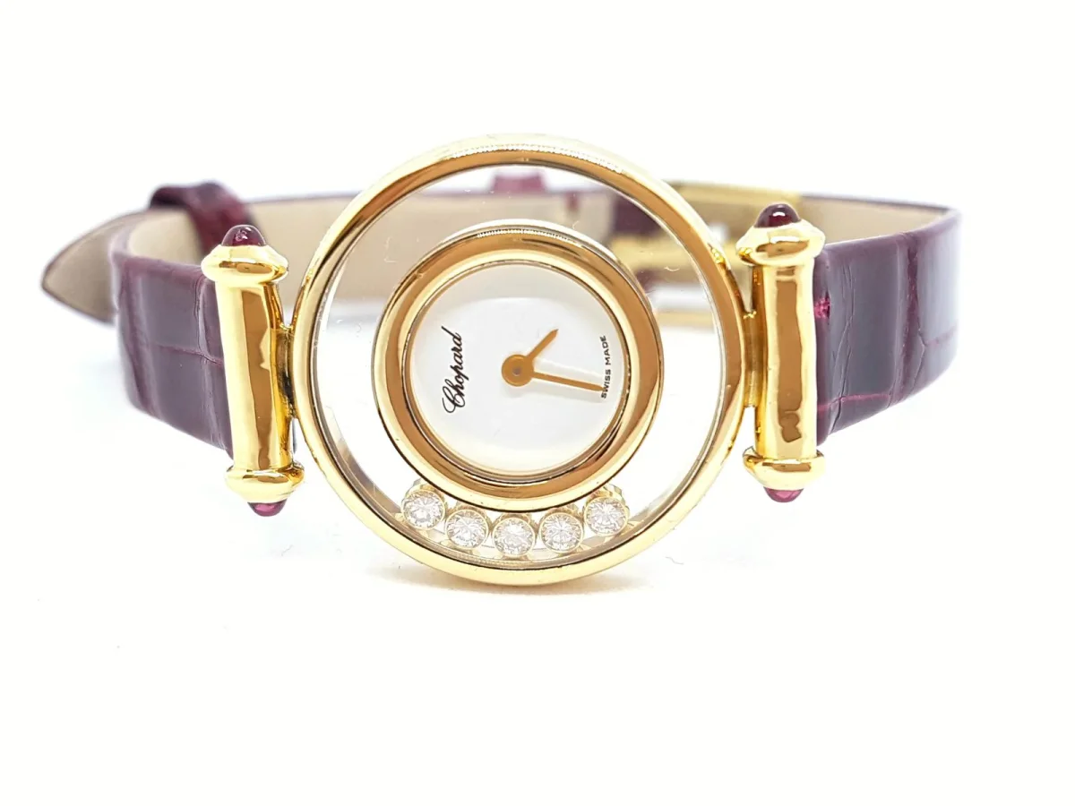 Montre femme signée de la maison Chopard, collection Happy Diamonds, en Or jaune 750 millièmes (18 carats), 5 diamants taille brillant d’un total de 0,15 ct couleur F-G, pureté FL, 4 rubis taillés en cabochon d’ un total de 0,28 ct, Bracelet en croco bordeaux neuf, longueur du bracelet 17 cm + 1,5 cm la boucle ardillon, largeur bracelet: 0,85 cm, Mouvement quartz, Cadran blanc sans index, Taille du boitier 21 mm, année 1987, valeur: 5330€, Poids total: 16,52 g, poinçonnée et numérotée: 360289 4112, excellent état.