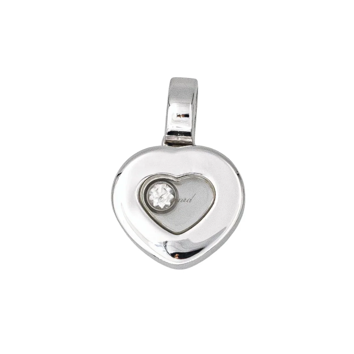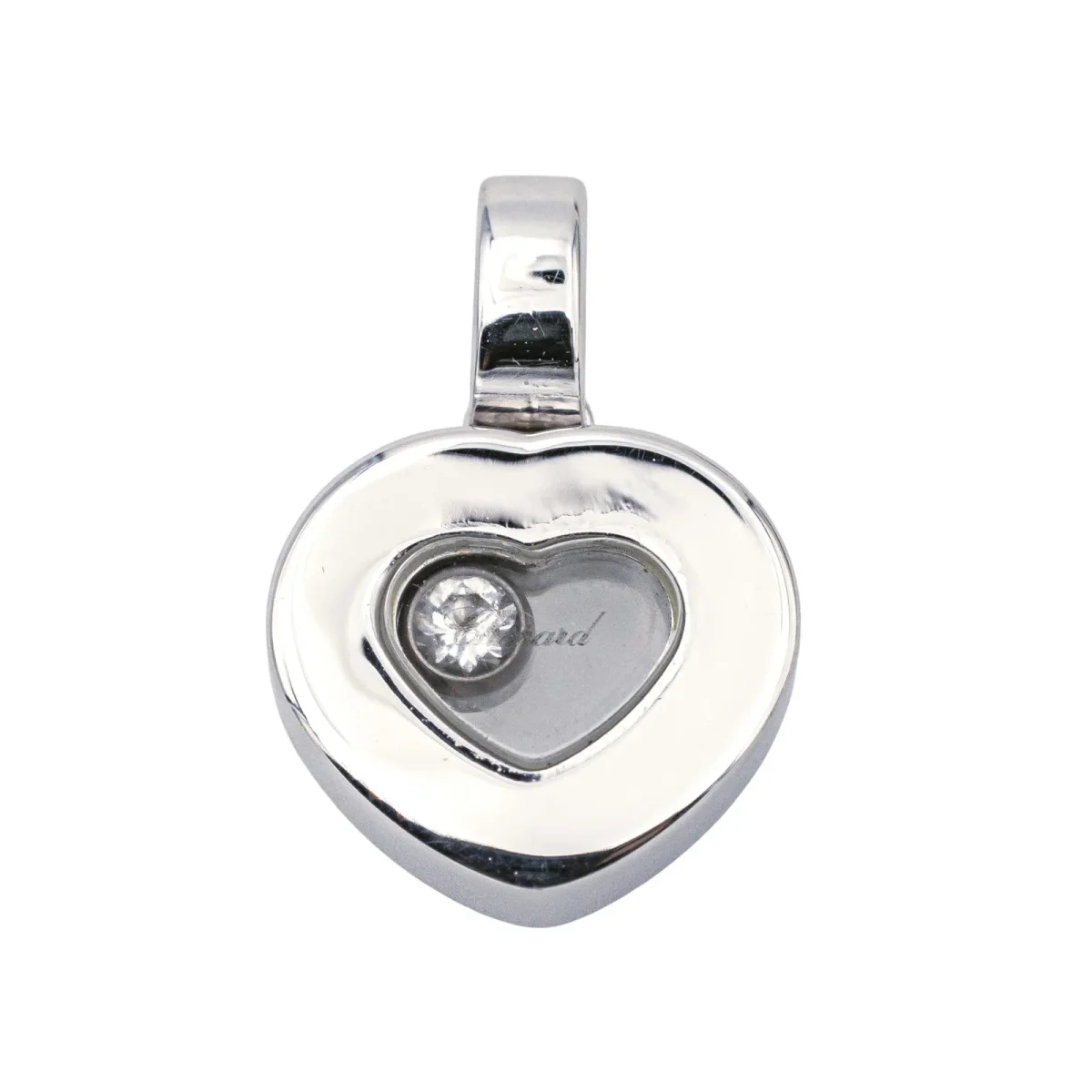 Pendentif signé de la Maison Chopard, collection Happy Diamonds, en or blanc 750 millièmes (18 carats), diamant mobile, taille brillant environ G/VVS d’environ 0,05 ct, dimensions: 1,5 cm x 1 cm, poids total: 3,67 g, poinçon saint bernard, numéroté : 792897-3136157, excellent état