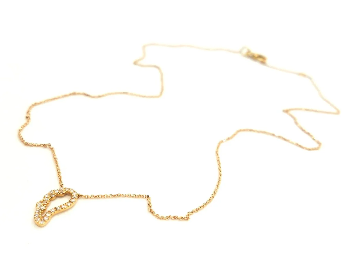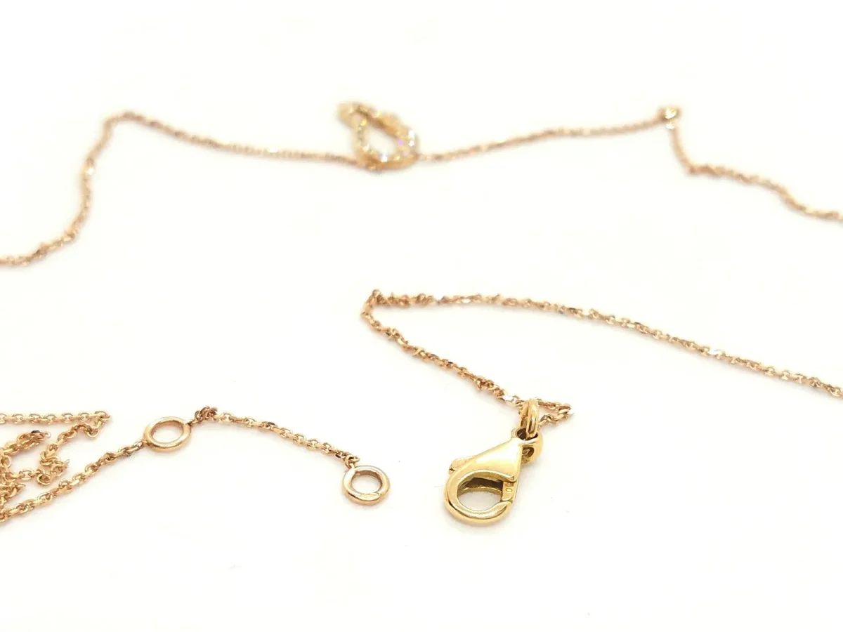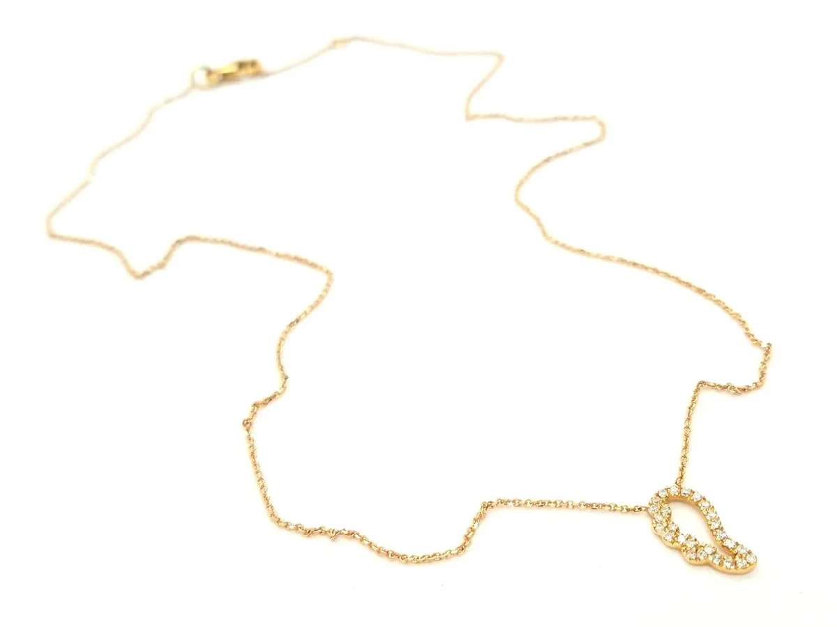 Collier en or rose 750 millièmes (18 carats), pendentif aile d’ange, pavé de diamants taille brillant G-VS pour un total de 0,12 ct, chaîne maille forçat de 0,7 mm de largeur, longueur chaîne: 42 cm avec anneau intermédiaire à 38,5 cm, dimensions du motif: 1,16 cm x 0,65 cm, poids total: 2,06 g, poinçon tête d’aigle, état neuf