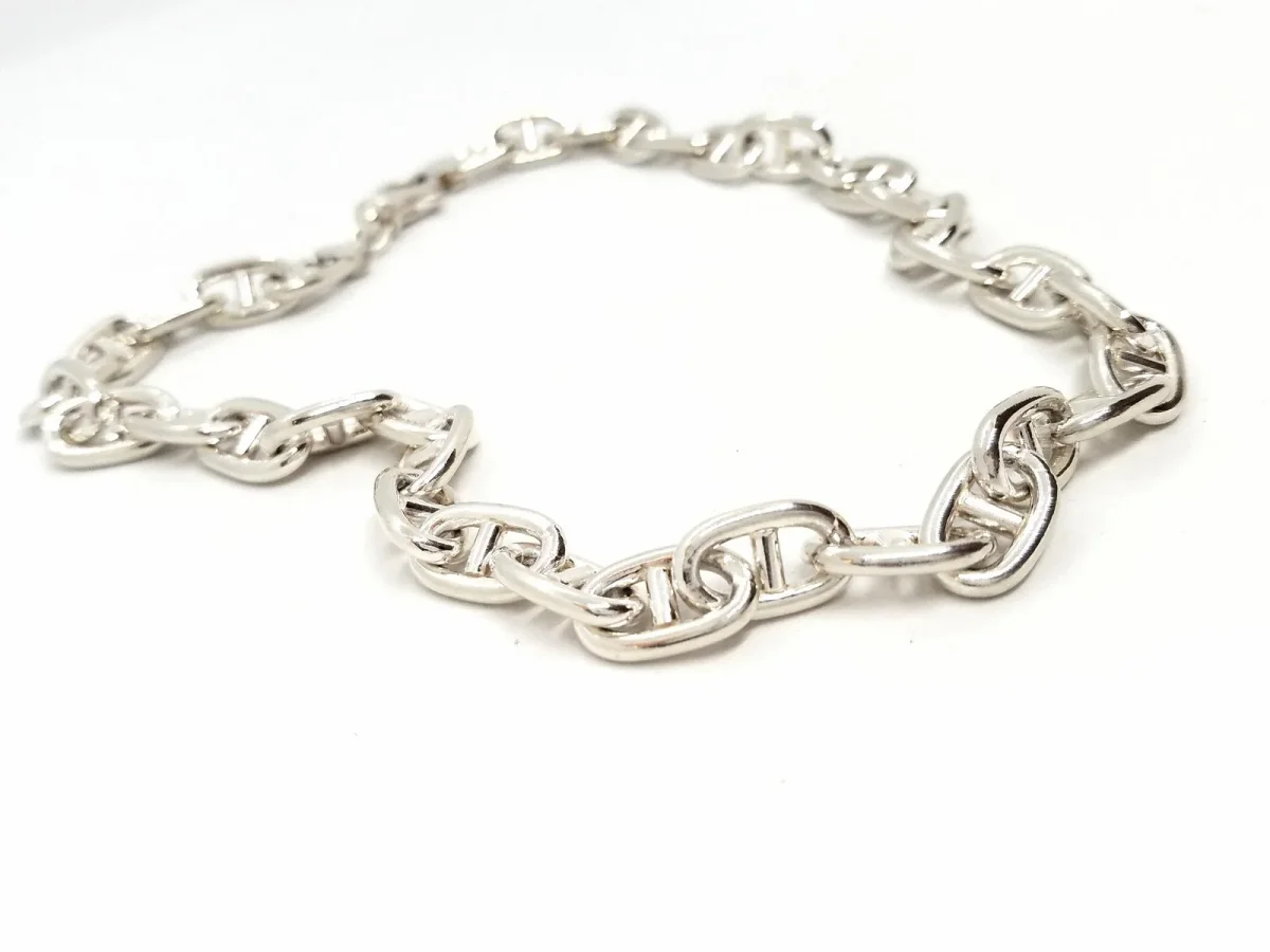 Collier en Argent 925, Grosse maille marine, dimensions d’un maille: 1,63 cm x 0,98 cm, épaisseur: 0,25 cm, dimension fermoir: 2,33 cm x 1,35 cm, longueur: 44 cm, poids total: 76,30 g, état neuf