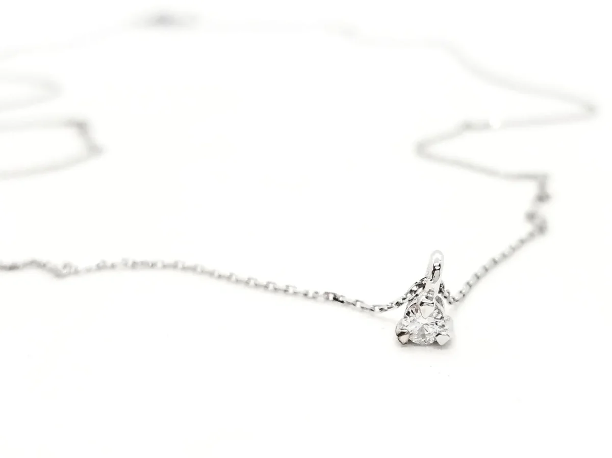 Collier en or blanc 750 millièmes (18 carats), fine chaîne en maille forçat, un diamant taille brillant G-H V-SI de 0,08 ct, seri trois griffes, Longueur: 42 cm avec anneau intermédiaire à 39 cm, dimensions pendentif: 0,59 cm x 0,38 cm (bélière incluse), largeur de la chaîne: 0,7 mm, poids total: 1,45 g, poinçon tête d’aigle, état neuf