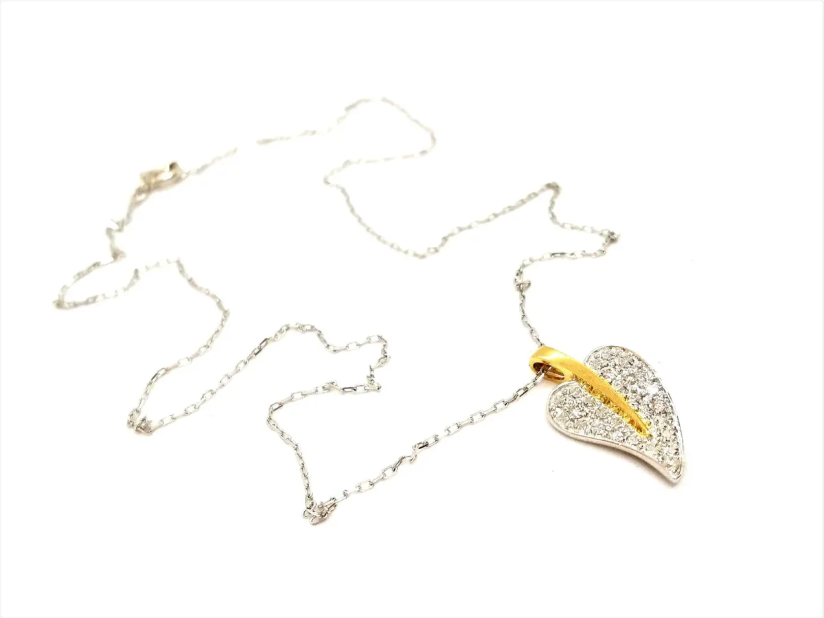 Collier en or 750 millièmes (18 carats), chaîne en or blanc, pendentif coeur bicolore en or jaune et serti sur or blanc, 5 diamants taille brillant H-SI pour environ 0,03 ct au total, longueur chaîne: 43 cm, dimensions pendentif: 1,9 cm x 1,1 cm (bélière incluse), poids total: 2,32 g, poinçon tête d’aigle sur l’anneau de bout, excellent état