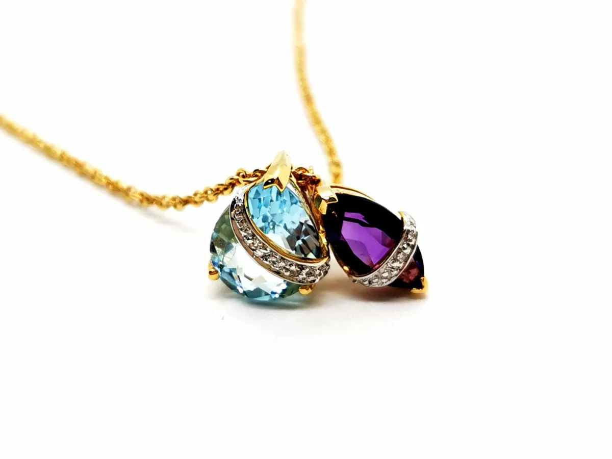 Chaîne et pendentif en or jaune 750 millièmes (18 carats), pendentif serti d’une améthyste navette d’environ 0,70 ct (10 mm x 5 mm), d’une topaze poire d’environ 3 cts (10 mm x 7,8 mm), et serti sur or blanc de 3 diamants, taille brillant, environ G-H/VSI pour environ 0,015 ct au total, longueur chaîne: 42 cm, largeur chaîne: 0,13 cm, dimensions pendentif: 1,58 cm x 1,07 cm, poids total: 5,51 g, poinçon tête d’aigle, excellent état