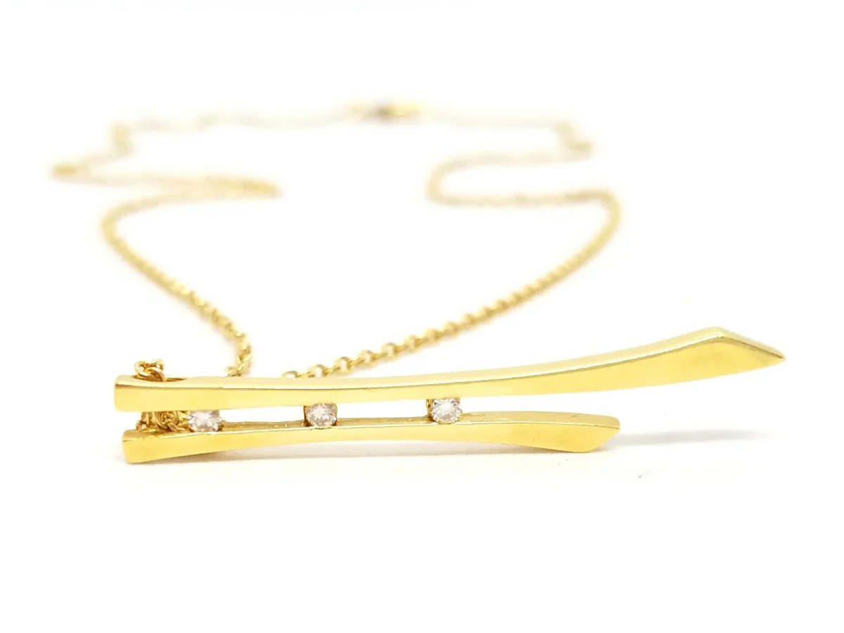 Collier en or jaune 750 millièmes (18 carats), chaîne et pendentif, serti de 3 diamants taille brillant G-H VSI pour environ 0,06 ct au total, dimensions pendentif: 4 cm x 0,69 cm, longueur chaîne: 42 cm, largeur chaîne: 0,08 cm, poinçon tête d’aigle, poids total: 5,74 g, excellent état
