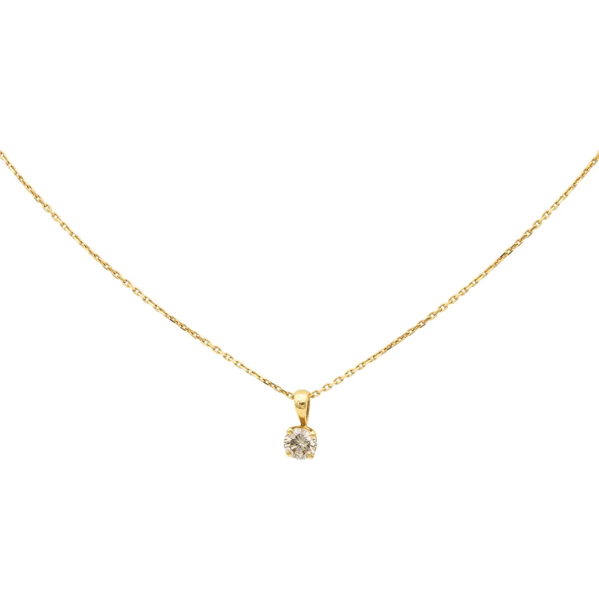 Collier en Or jaune 750 millièmes (18 carats), Pendentif serti d’un diamant taille brillant K-SI pour environ 0,31 ct, Dimensions pendentif: 0,90 cm x 0,43 cm, longueur chaîne: 40 cm, largeur chaîne: 0,08 cm, Poinçon tête d’aigle, Poids total: 1,98 g, état neuf