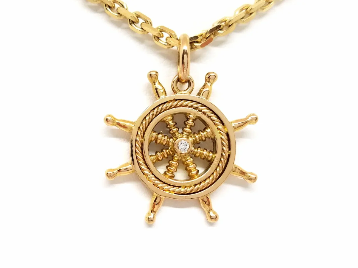 Collier en or jaune 750 millièmes (18 carats), chaîne maille forçat limée, longueur: 60 cm, largeur: 0,32 cm, pendentif marin de diamètre: 2,92 cm, serti de deux diamants taille brillant G VSI pour environ 0,06 ct au total,poids total: 37,44 g, poinçon tête d’aigle, excellent état
