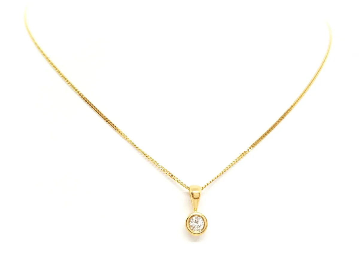 Collier en Or jaune 750 millièmes (18 carats), Pendentif serti clos diamant taille brillant G-H V-SI pour environ 0,18 ct, Dimensions pendentif: 1,16 cm x 0,52 cm, longueur chaîne: 40 cm, largeur chaîne: 0,09 cm, Poinçon tête d’aigle, Poids total: 2,74 g, état neuf