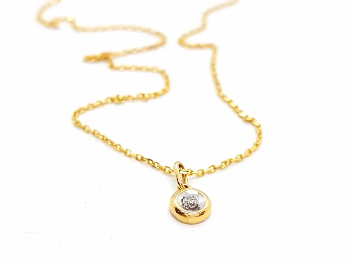 Collier en or jaune 750 millièmes (18 carats), pendentif serti d’un diamant taille brillant G-H SI d’environ 0,035 ct, longueur de la chaîne: 40 cm, dimensions pendentif: 0,62 cm x 0,62 cm (sans la bélière), poids total: 3,11 g, poinçon tête d’aigle sur l’anneau de bout, excellent état