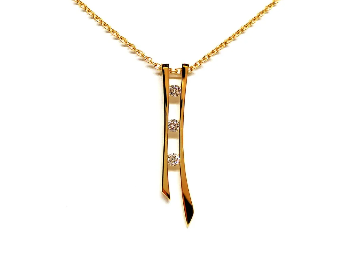 Collier pendentif Trilogie, en or jaune 750 millièmes (18 carats), composé d’une chaîne maille ronde, et d’un pendentif ligne de 3 diamants, taille brillant environ G/VS, d’environ 0,09 ct chacun, poids total diamants: 0,27 ct environ, entouré de 2 bras en or jaune, longueur de la chaîne: 42 cm, largeur chaîne: 0,17 cm, dimensions du pendentif: 3,90 cm x 0,71 cm x 0,31 cm, poids total: 7,02 g, poinçonné tête d’aigle, excellent état.