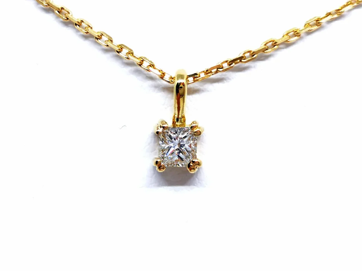 Collier en or jaune 750 millièmes (18 carats), pendentif serti d’un diamant taille princesse G-H VSI d’environ 0,25 ct, chaîne maille forçat, longueur chaîne: 45 cm, largeur chaîne: 0,11 cm, dimensions pendentif (bélière incluse): 0,92 cm x 0,35 cm, poids total: 3,32 g, poinçon tête d’aigle, excellent état