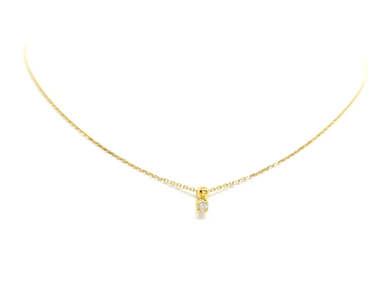 Collier en or jaune 750 millièmes (18 carats), pendentif serti d’un diamant taille brillant G-H V-SI de 0,03 ct, serti 4 griffes, chaîne maille de forçat, longueur: 41,5 cm avec anneau intermédiaire à 39 cm, largeur de la chaîne: 0,7 mm, dimensions pendentif: 0,6 cm x 0,26 cm (bélière incluse), poids total: 1,61 g, poinçon tête d’aigle, état neuf