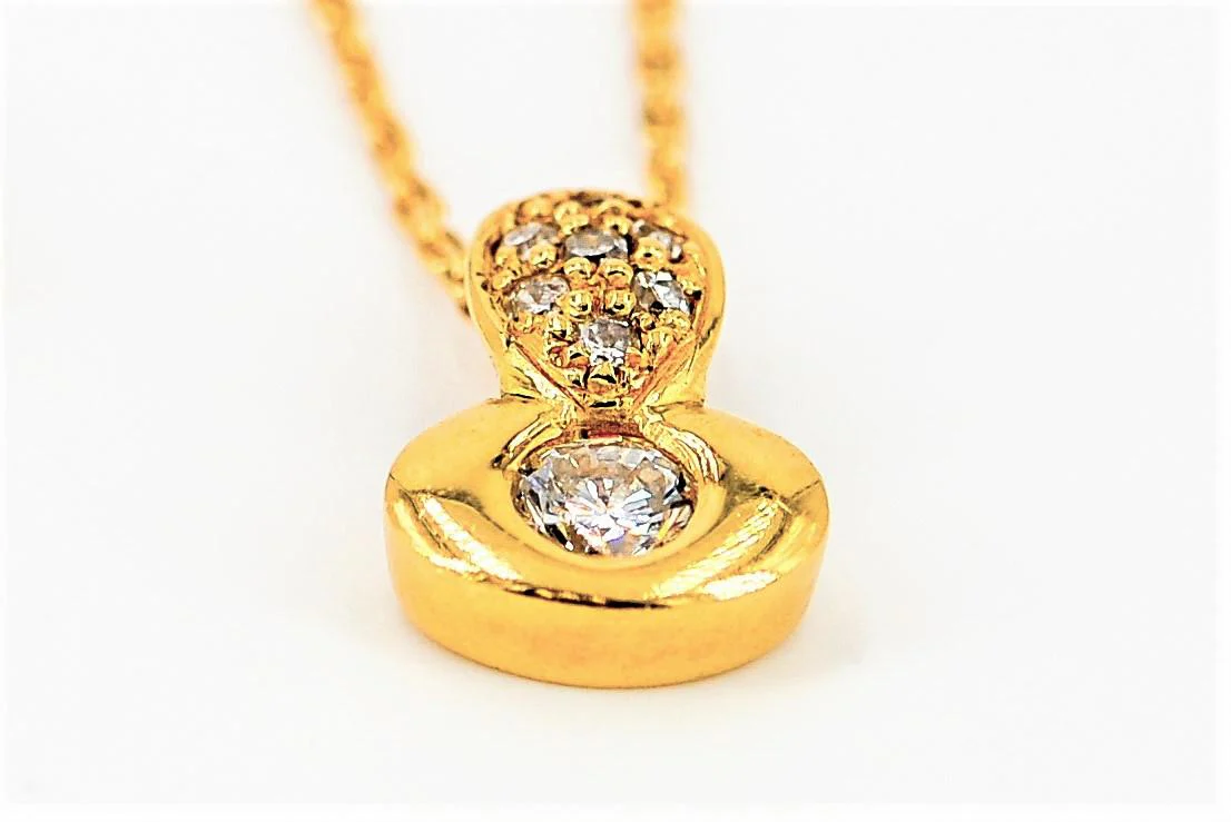 Collier en or jaune 750 millièmes (18 carats) de 2,60 g serti d’un diamant central taille brillant d’environ 0,11 ct, H-SI, de diamants sur la bélière pour environ 0.07 ct taille rose J-P,. longueur de la chaîne: 42 cm, taille du pendentif: 1,1 cm x0,8 cm, En très bon état Poinçonné