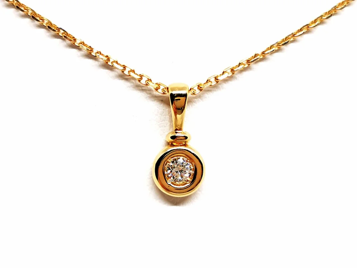 Chaine et pendentif serti d’un diamant, en or jaune 750 millièmes (18 carats), diamant taille brillant environ G-VS, d’environ 0,20 ct, serti clos, longueur de la chaine: 40 cm, largeur de la chaine: 0,12 cm, dimensions du pendentif avec la bélière: 1,42 cm x 0,67 cm, poids total: 4,06 g, poinçon tête d’aigle, excellent état