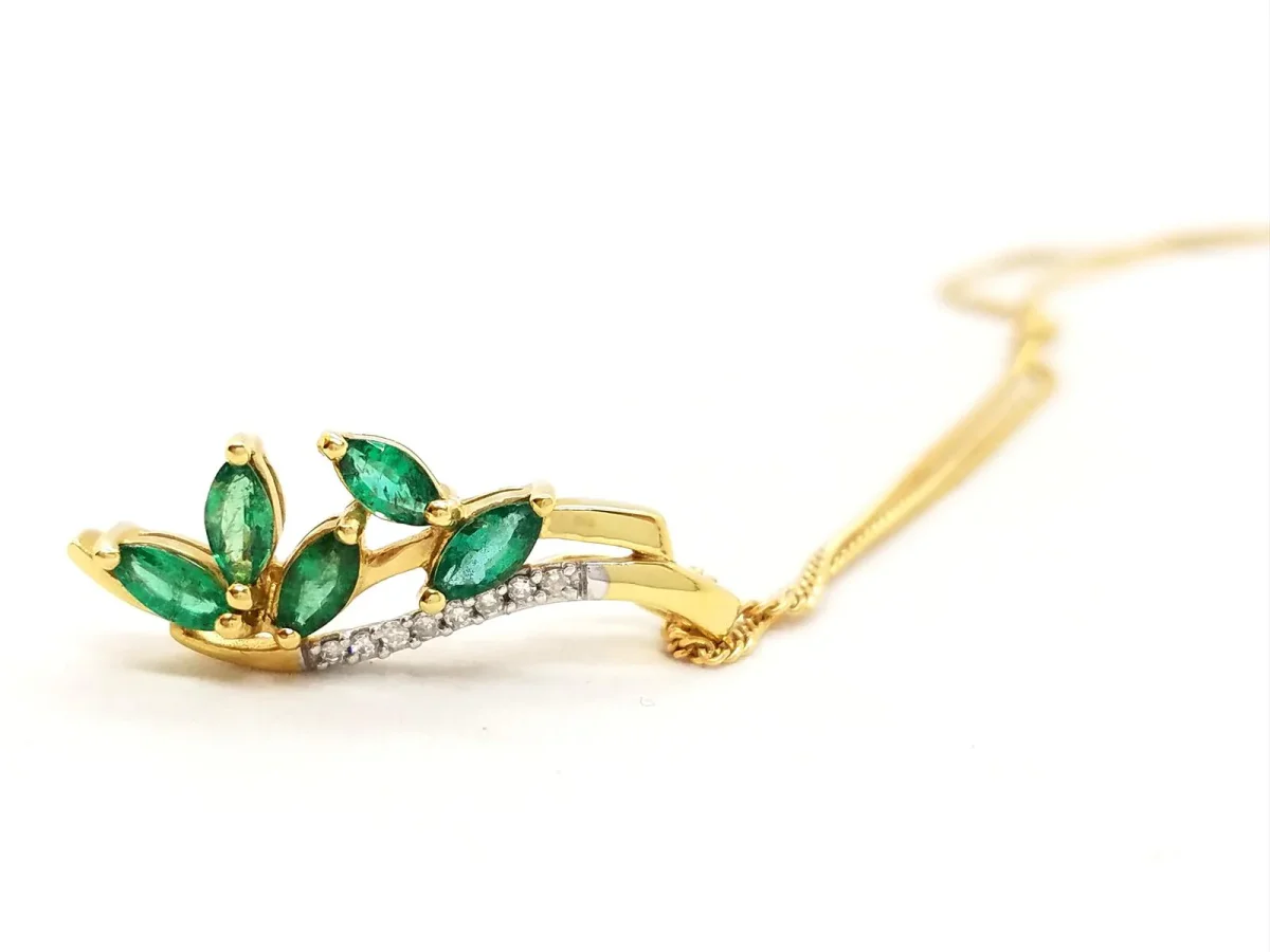 Collier en Or jaune 750 millièmes (18 carats), Pendentif serti de 5 émeraudes taille navette de dimensions 4,8 mm x 2,2 mm pour environ 0,42 ct au total, et de 8 diamants taille 8/8 H V-SI pour environ 0,04 ct au total, Dimensions pendentif: 2,5 cm x 0,95 cm, longueur chaîne: 40 cm, largeur chaîne: 0,09 cm, Poinçon tête d’aigle, Poids total: 3,93 g, état neuf