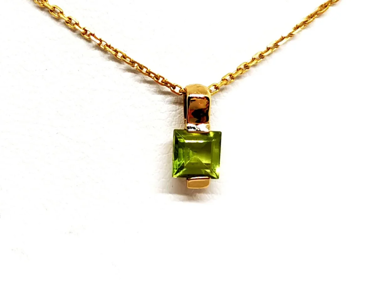Collier en or jaune 750 millièmes (18 carats), chaîne maille forçat, pendentif serti d’un péridot carré, d’environ 0,61 ct, longueur chaîne: 46 cm, largeur chaîne: 0,09 cm, dimensions pendentif: 1,08 cm x 0,5 cm, poids total: 2,80 g, poinçon tête d’aigle sur l’anneau de bout, excellent état