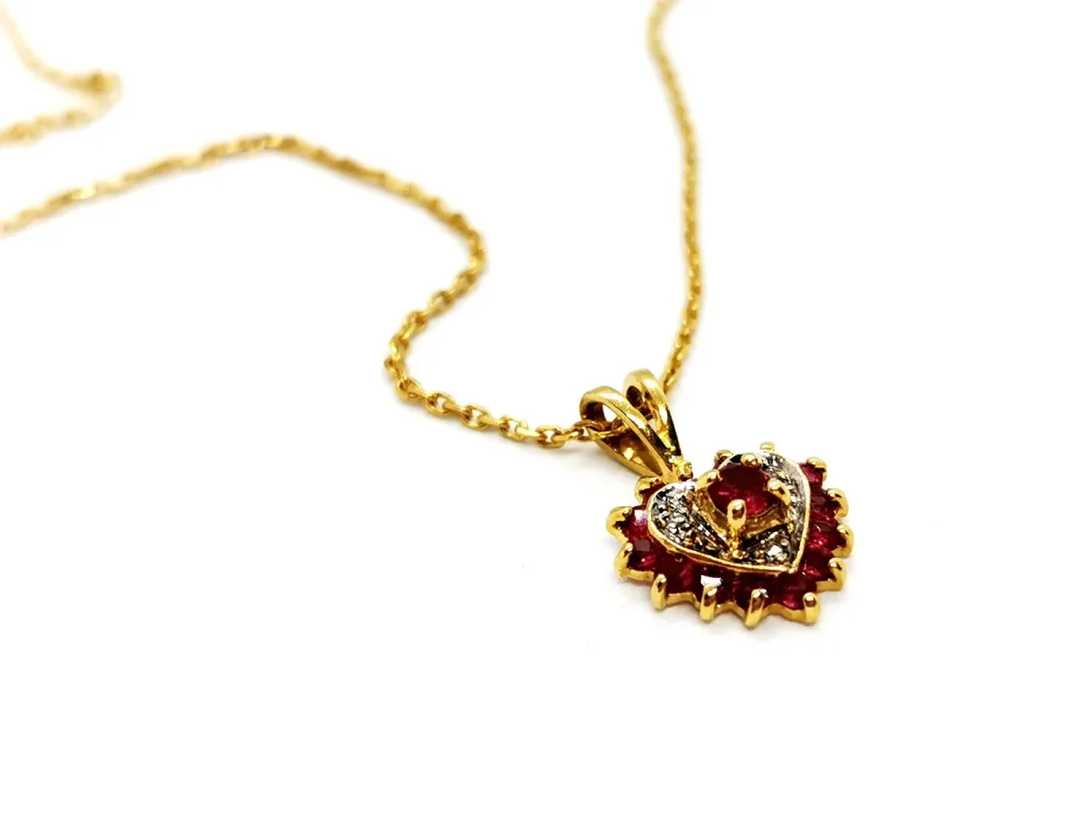 Collier pendentif coeur rubis et diamants, en or jaune 750 millièmes (18 carats), composé d’une chaîne maille forçat en or jaune, longueur de la chaîne: 44 cm, et d’un pendentif en or jaune, en forme de coeur, serti de 13 rubis d’environ 0,025 ct chacun, d’un rubis au centre d’environ 0,04 ct, et de 4 diamants taille brillant, environ G/VS, d’environ 0,01 ct chacun, poids total rubis: environ 0,365 ct, poids total diamants: environ 0,04 ct, dimensions du pendentif: 1,64 cm X 1,14 cm X 0,44 cm, poids total: 3,68 g, poinçonné tête d’aigle, excellent état.