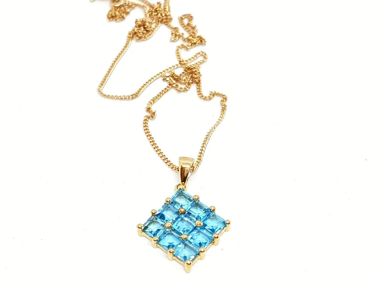 Pendentif carré en or jaune 18 carats, Serti de 9 topazes bleues taillées carré pour un total d’environ 2,70 ct, longueur de la chaîne: 45 cm, dimensions pendentif: 1,4 x 1,4 cm, Hauteur avec bélière: 2,5 cm, Poids : 5.68 g, poinçonné, excellent état