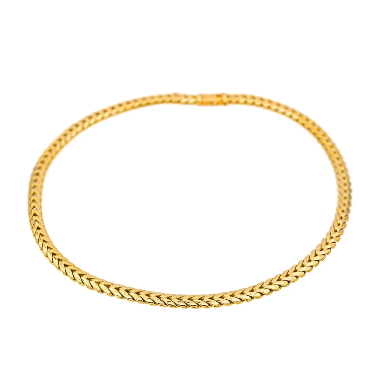 Collier en or jaune 750 millièmes (18 carats), maille épi, longueur : 43,00 cm, largeur : 0,63 cm, poids total : 33,80 g, poinçon tête d’aigle, excellent état