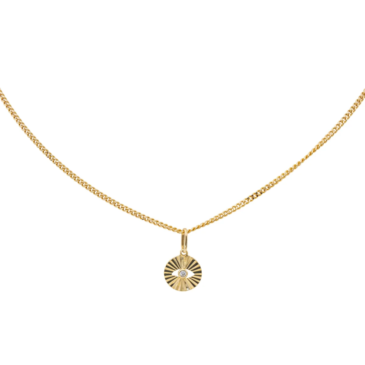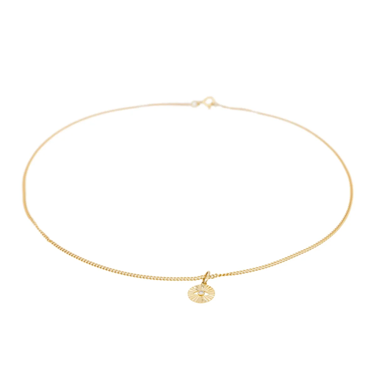 Collier en or jaune 750 millièmes (18 carats), motif serti d’un diamant , maille gourmette, poids du diamant: environ 0,02 ct, environ H-SI, longueur de la chaine: 38 cm, longueur et largeur du pendentif (avec bélière): 1,51 cm x 0,92 cm, poids total: 4,27 g, poinçon tête d’aigle, excellent état