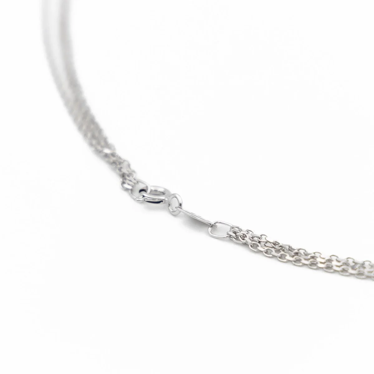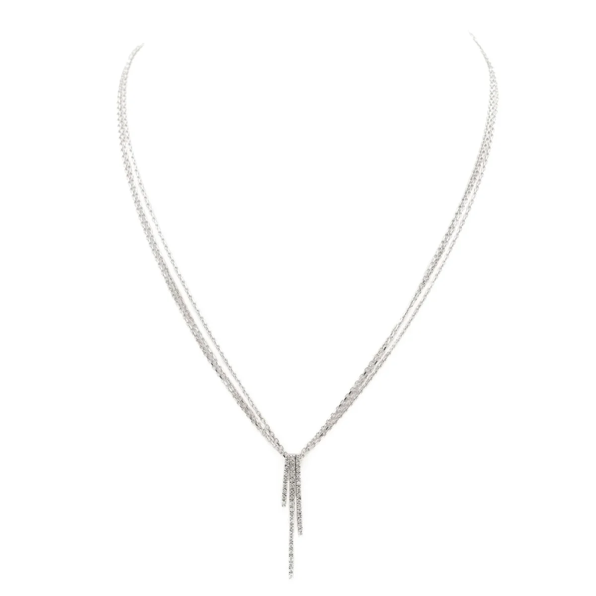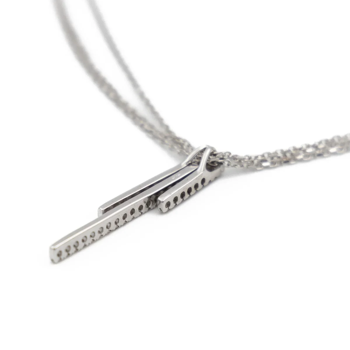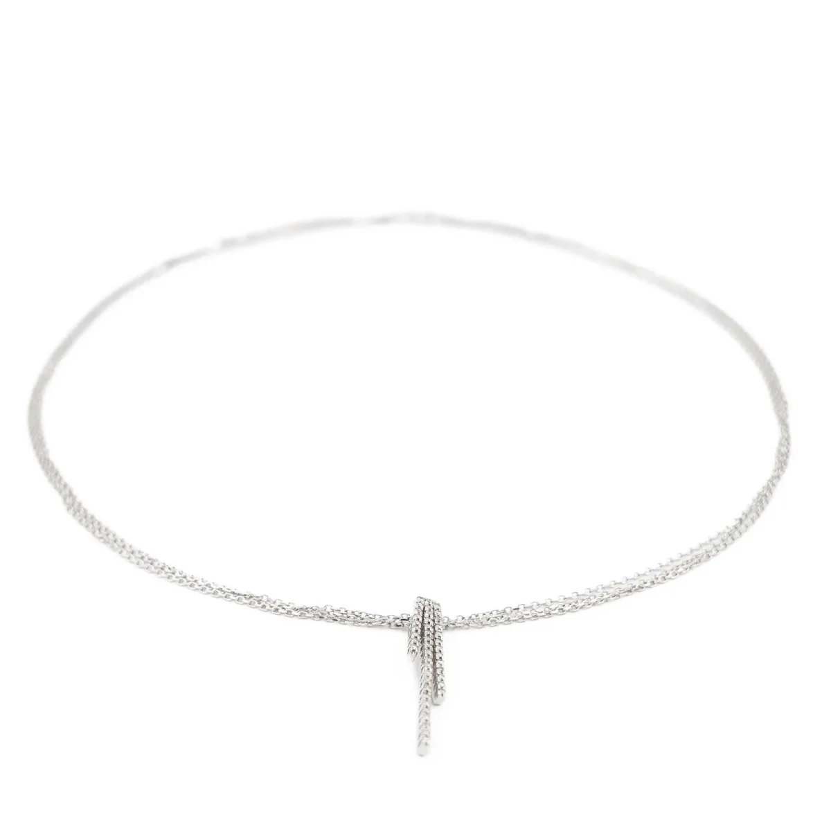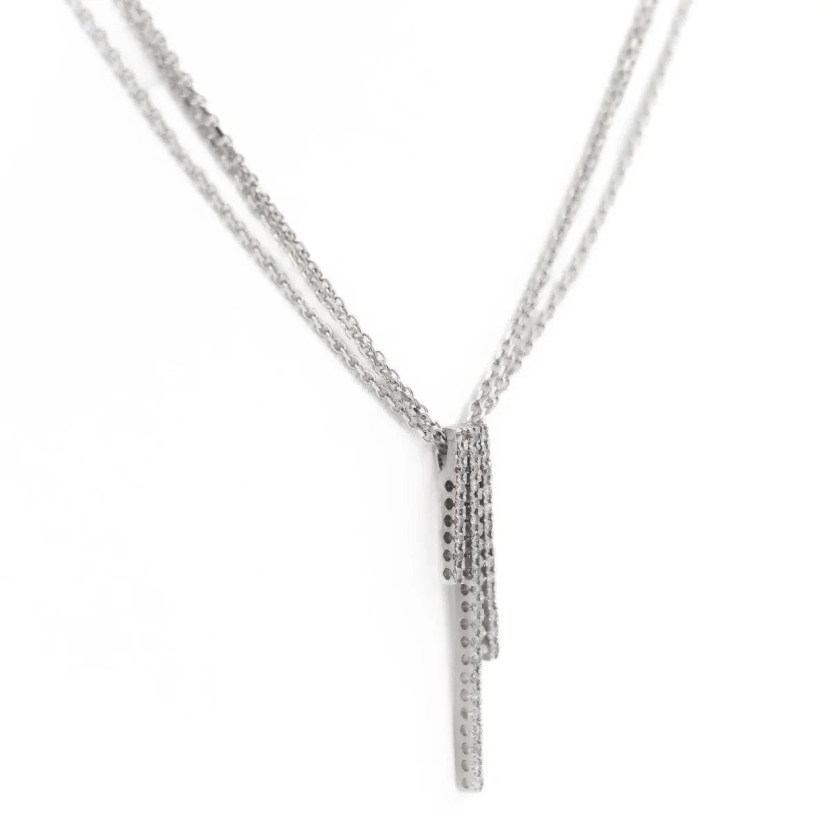 Collier diamants, en or blanc 750 millièmes (18 carats), triple chaîne maille forçat, pendentif représentant 3 baguettes, pavées de 43 diamants, taille brillant, environ H/VS d’environ 0,008 ct chacun, poids total diamants: environ 0,34 ct, longueur collier: 45 cm, dimensions pendentif: 3,68 cm x 0,6 cm, poids total: 9,56 g, poinçon hibou, excellent éat