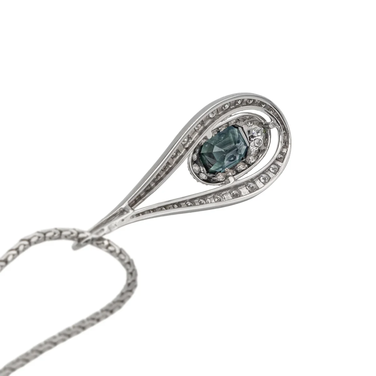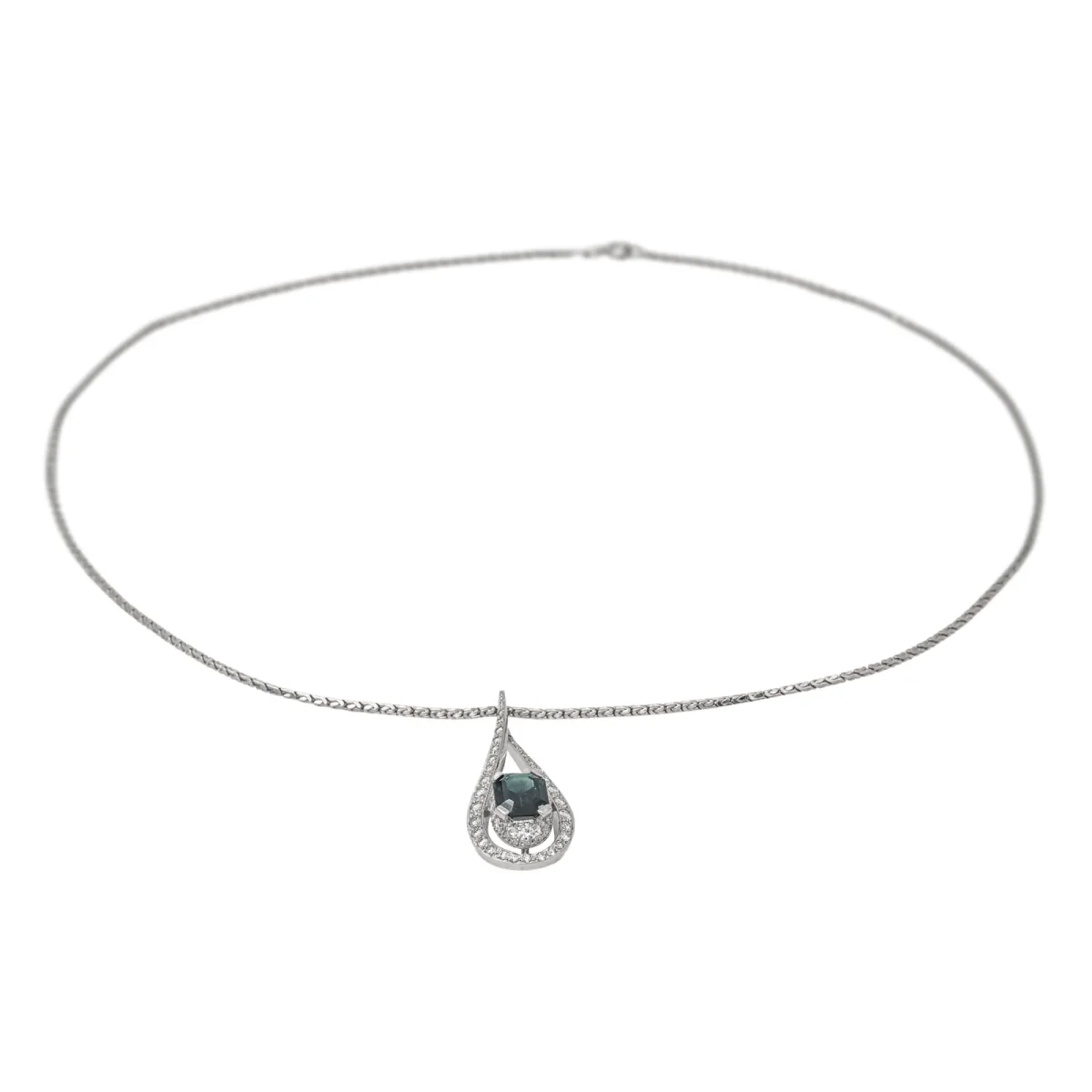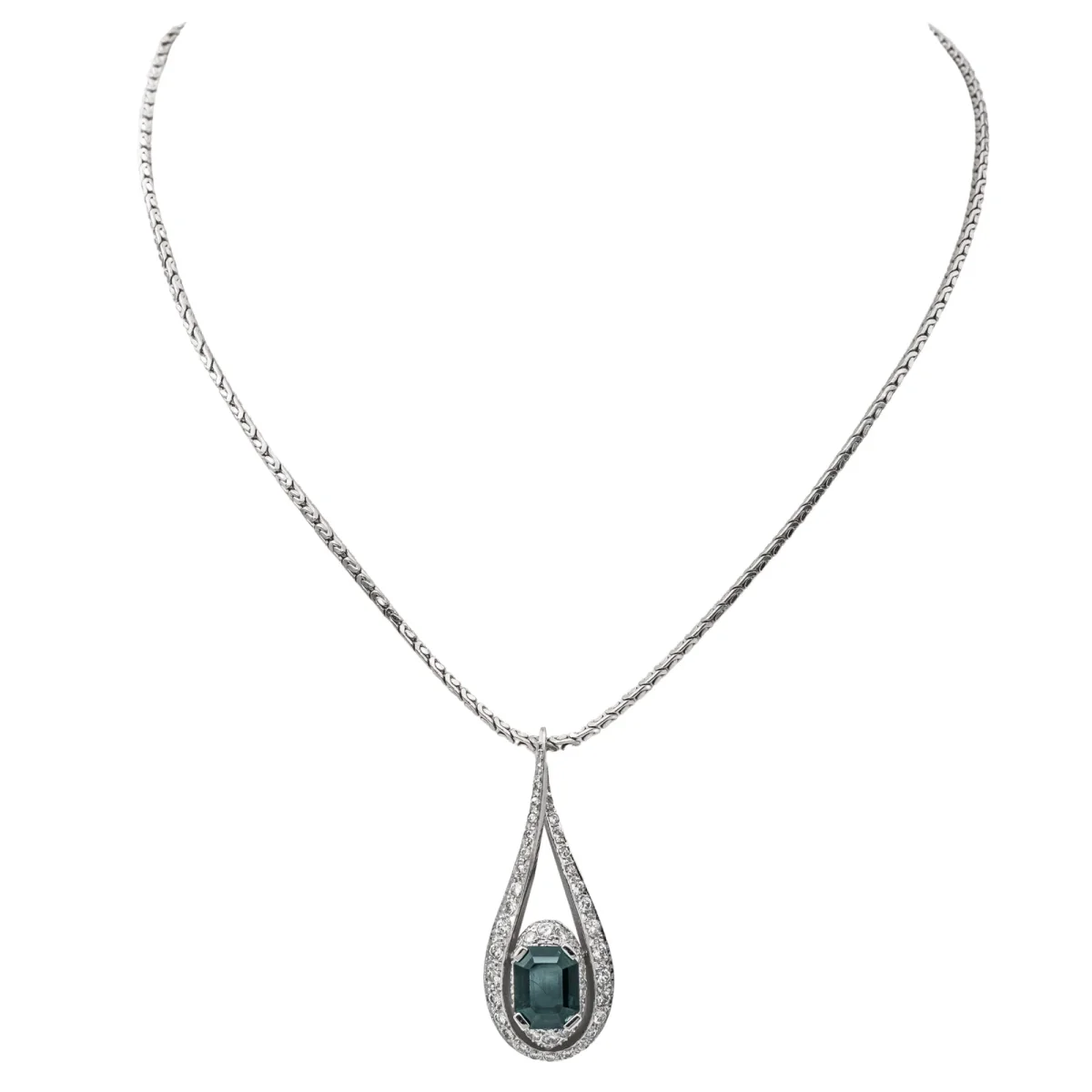 Collier avec pendentif en or blanc 750 millièmes (18 carats), serti d’un saphir et de diamants, un saphir de taille émeraude, d’un poids total d’environ 4,66 cts, entouré de 44 diamants taille brillant, environ G/VS, d’un poids total d’environ 1,20 cts, (19 diamants d’environ 0,01 ct chacun, 18 diamants d’environ 0,03 ct chacun, 10 diamants d’environ 0,05 ct chacun), longueur de la chaine : 60 cm, dimensions avec la bélière : 4,23 cm x 1,67 cm, poids total : 20,23 g, poinçon hibou, excellent état