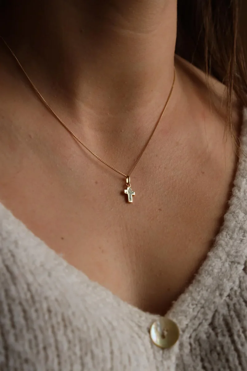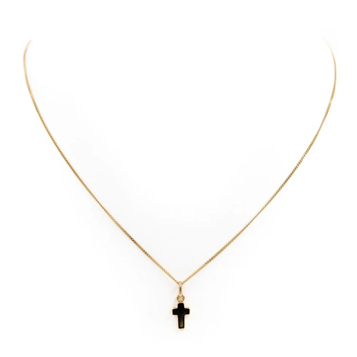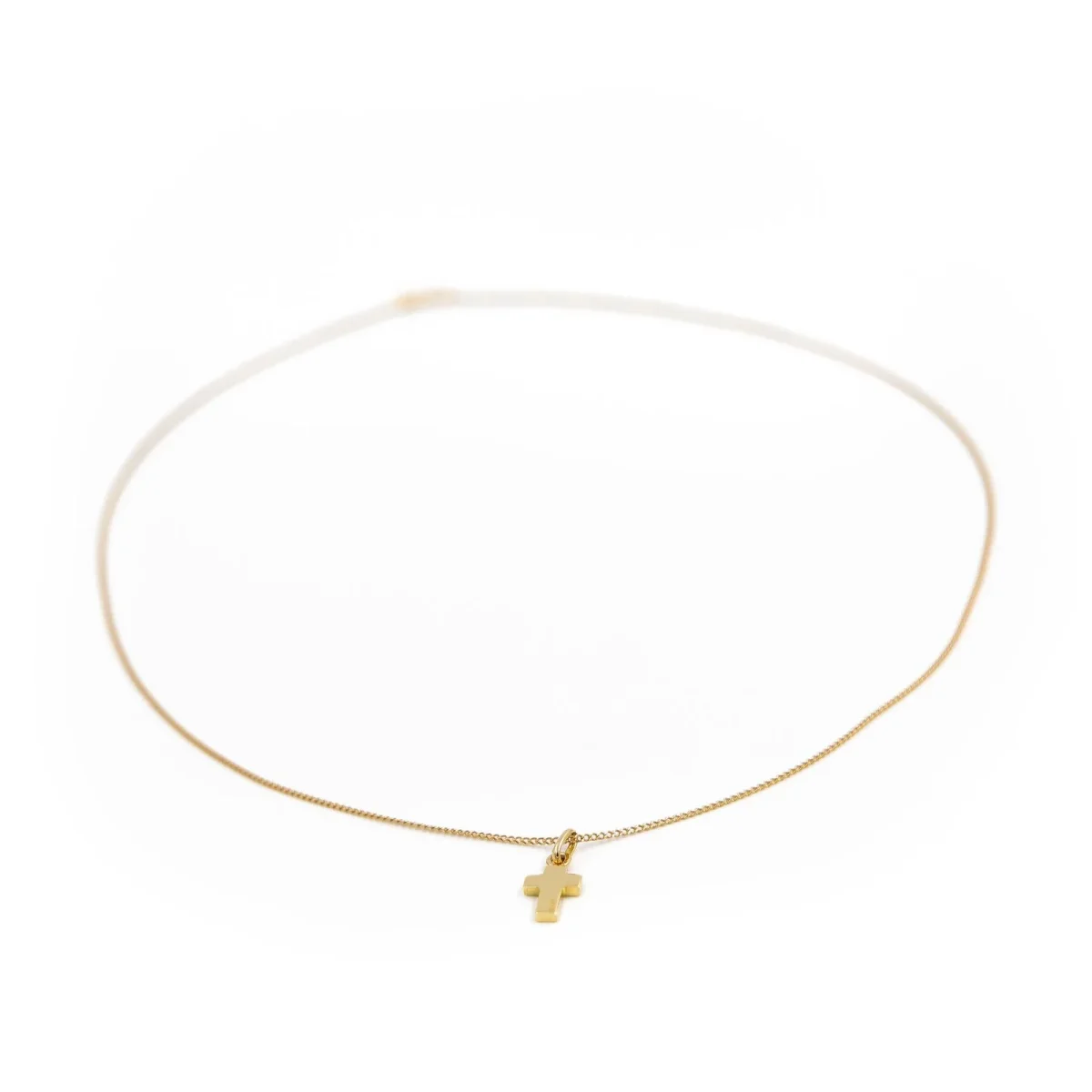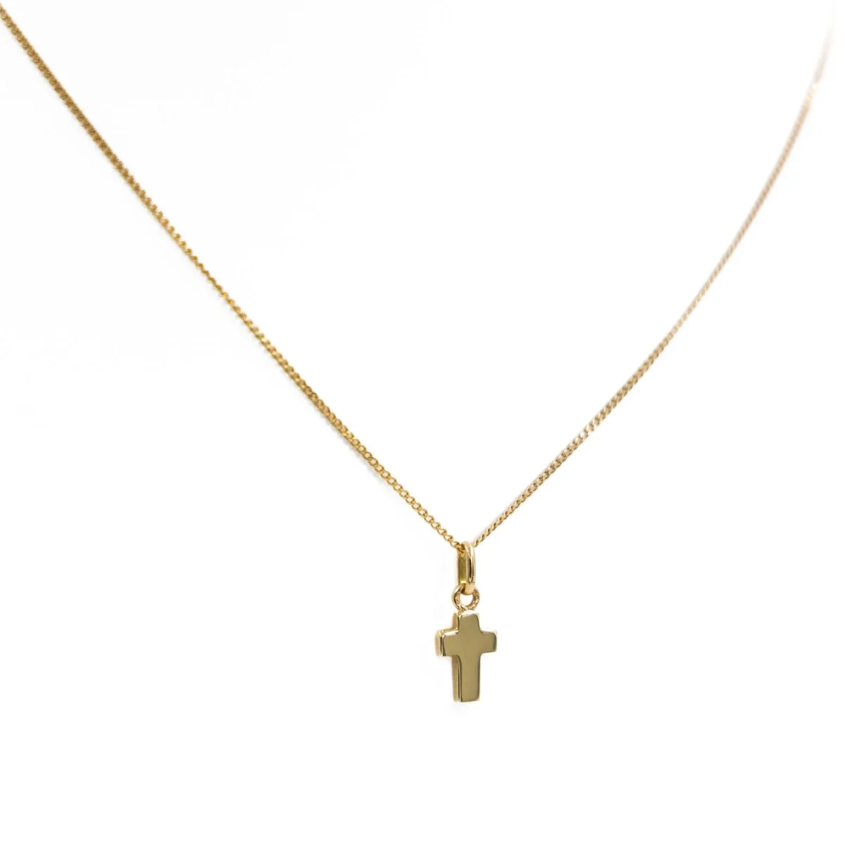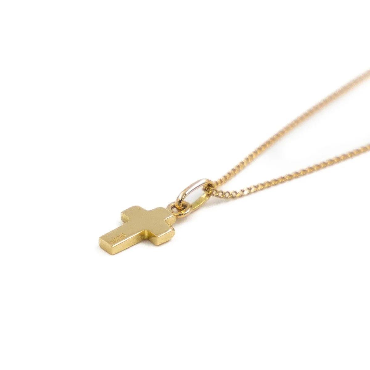 Chaine et pendentif croix AUGIS en or jaune750 millièmes (18 carats), dimensions du pendentif avec belière: 1,65 x 0,67 cm, longueur de la chaîne: 43,5 cm, poids total: 2,57 g, poinçon tête d’aigle, excellent état