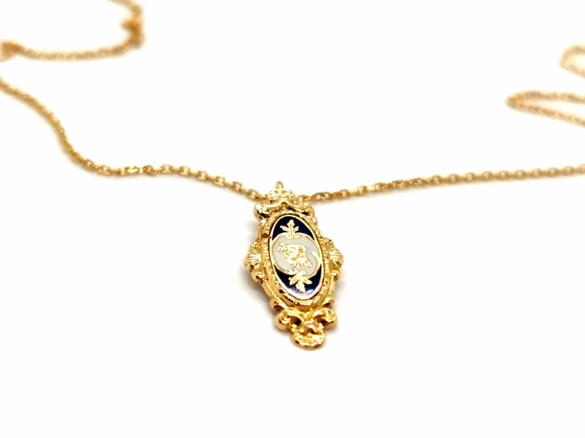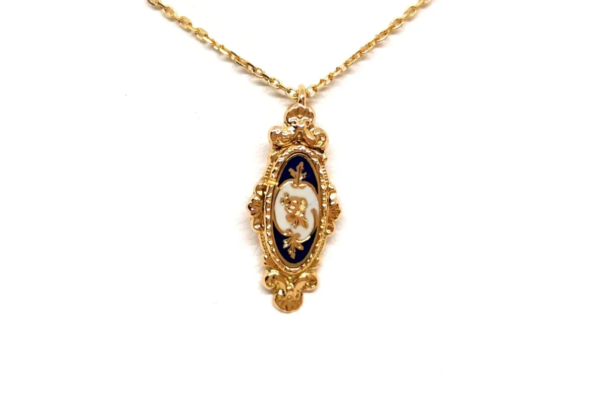 Collier pendentif résine, années 30, en or jaune 750 millième (18 carats) testé, chaîne maille forçat limée, longueur de la chaîne: 50,5 cm avec anneau intermédiaire à 41,5 cm, dimensions du pendentif: 2,19 cm X 0,91 cm, poids total: 2,62 g, défaut de polissage à verso du pendentif, excellent état.