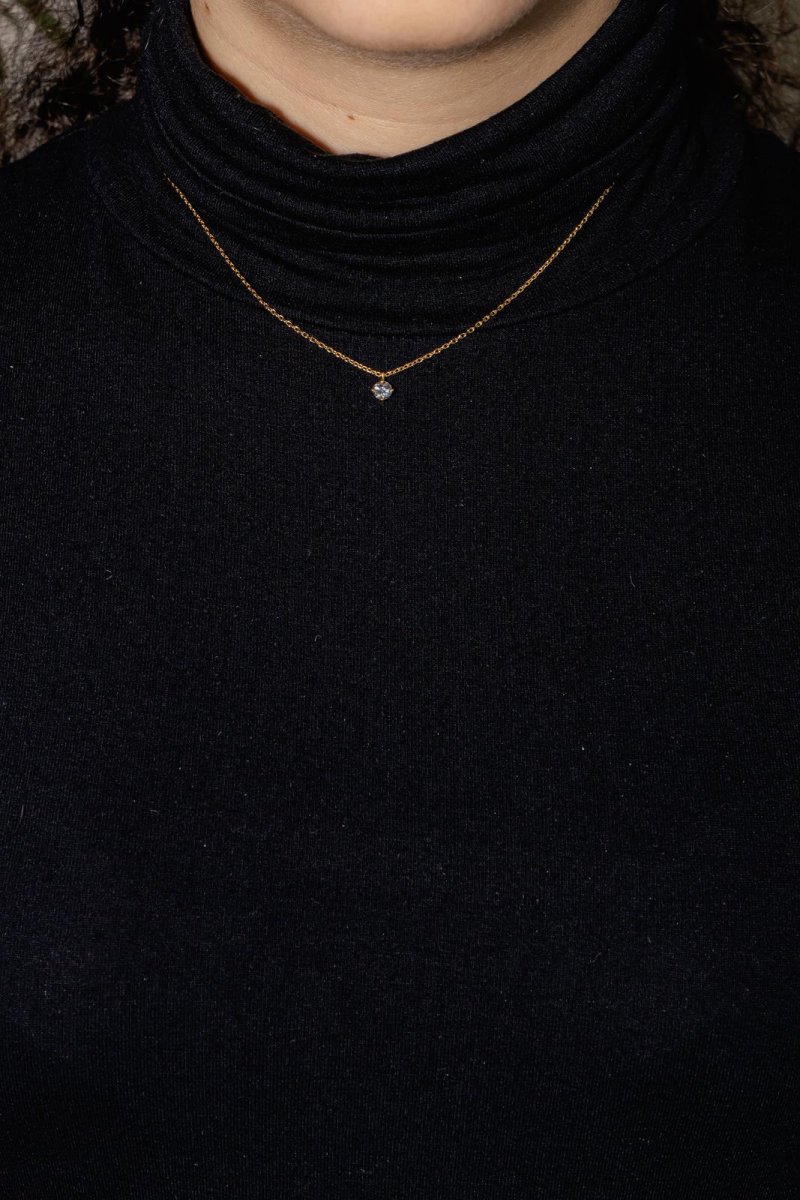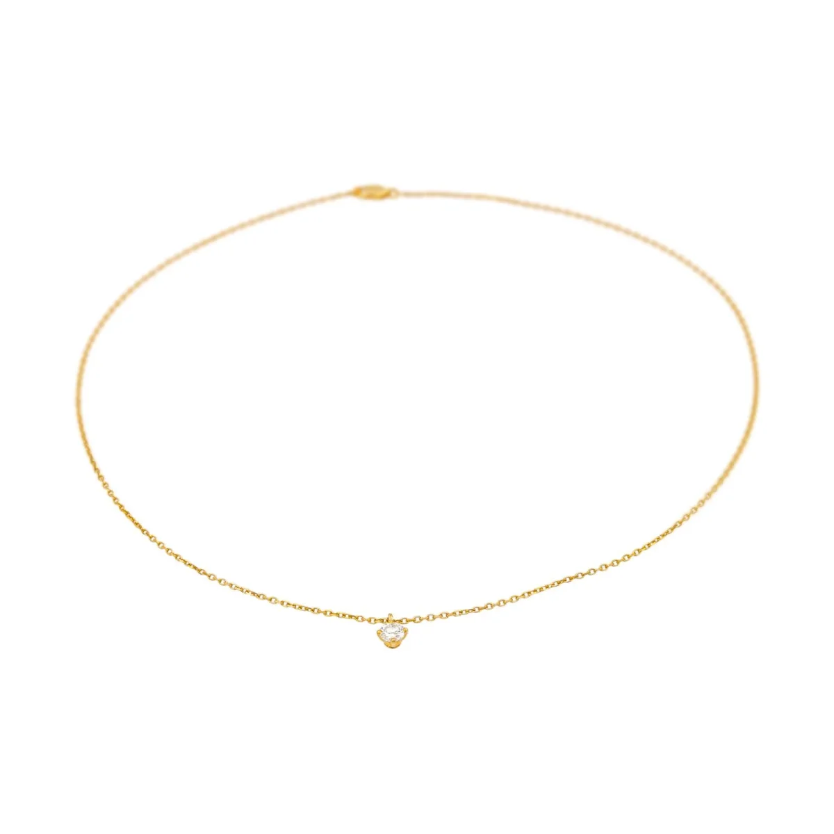Collier en or jaune 750 millièmes (18 carats), serti d’un diamant taille brillant, environ G-VS, d’un poids d’environ 0,34ct, dimensions avec la bélière : 0,79cm x 0,53cm, poids total : 2,81g, poinçon tête d’aigle, excellent état