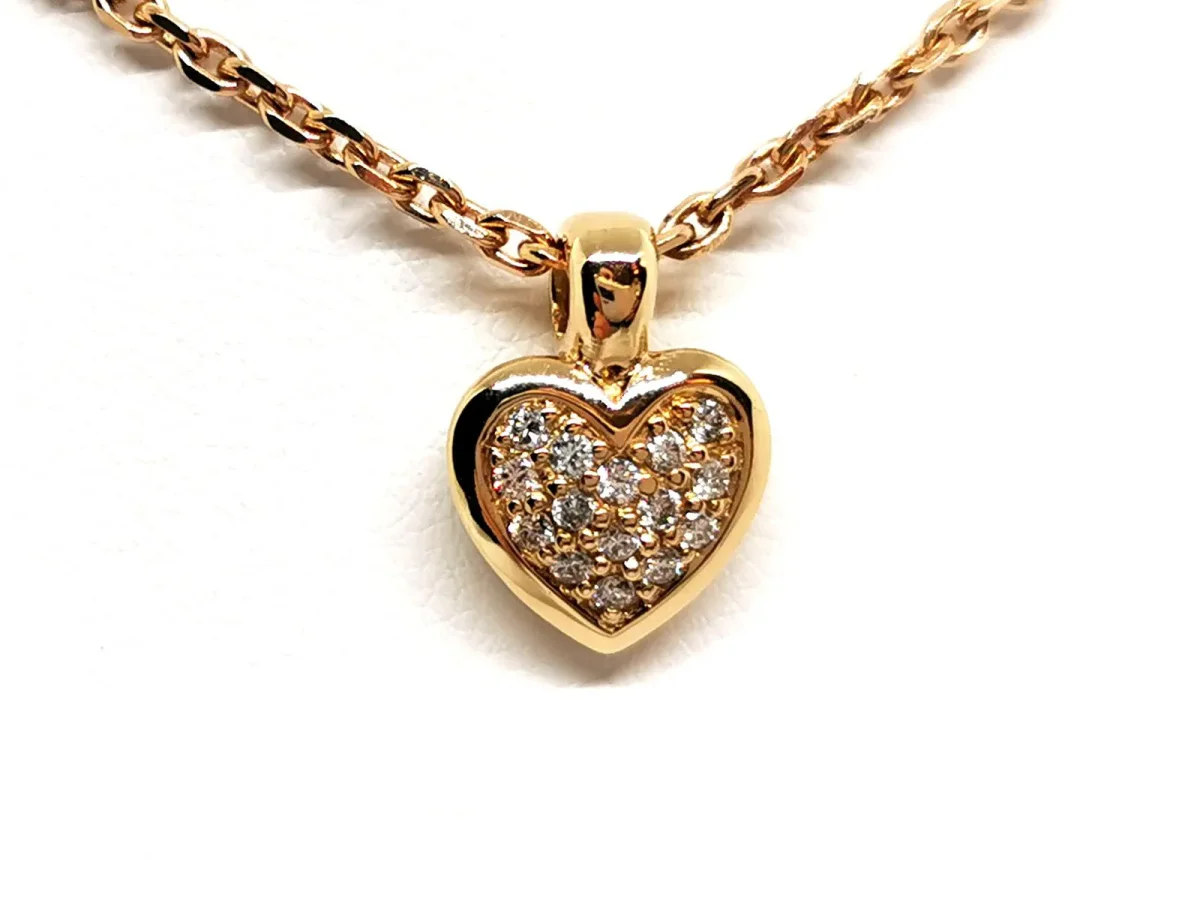 Collier chaîne et pendentif, coeur en or jaune 750 millièmes (18 carats), serti de 15 diamants ronds taille brillant, d’environ 0,02 ct chacun, G-H/VS, poids total diamants: environ 0,30 ct, longueur de la chaîne : 39,4 cm, dimensions du pendentif : 1,42 cm x 1,05 cm, poids total: 7,93 g, poinçonné tête d’aigle, excellent état.