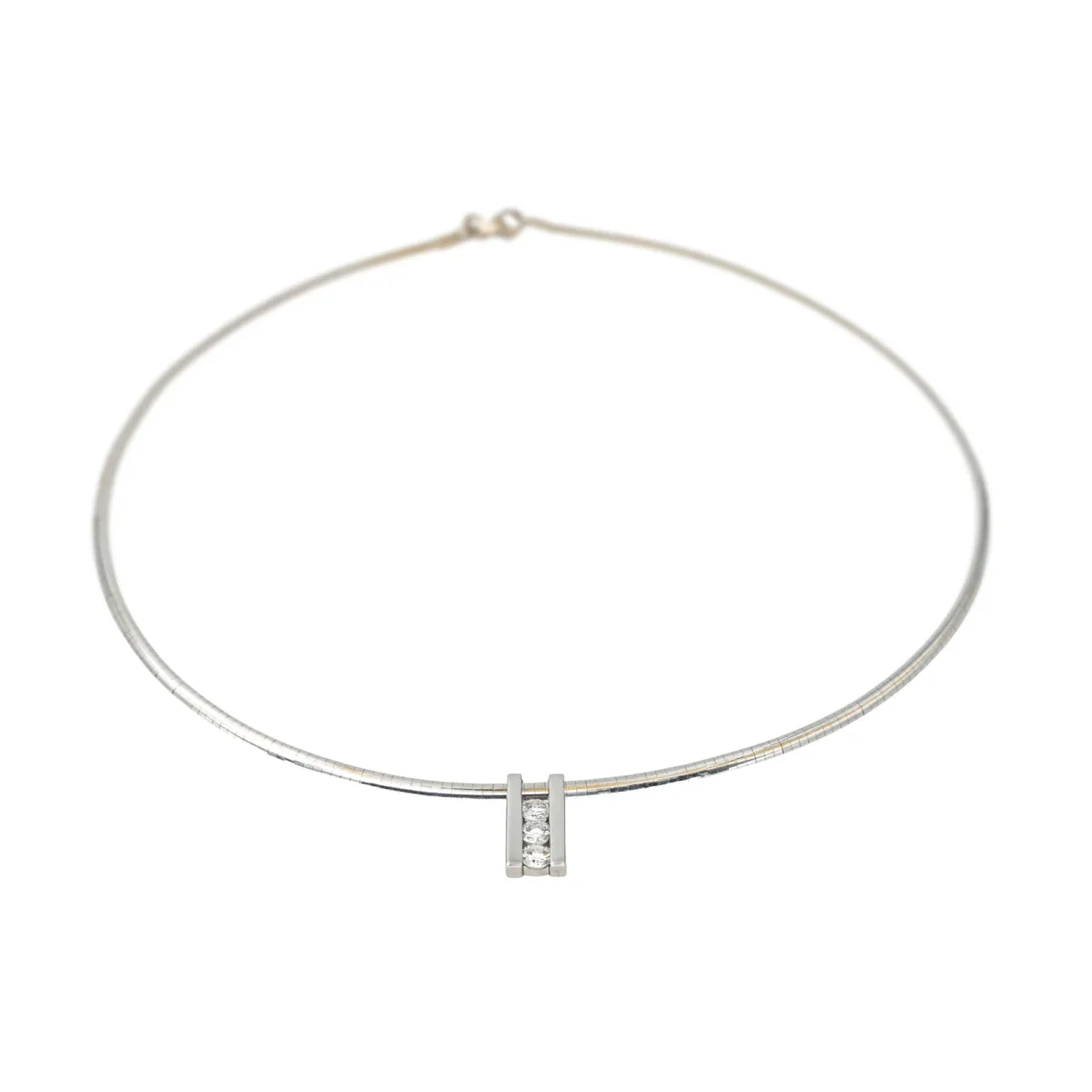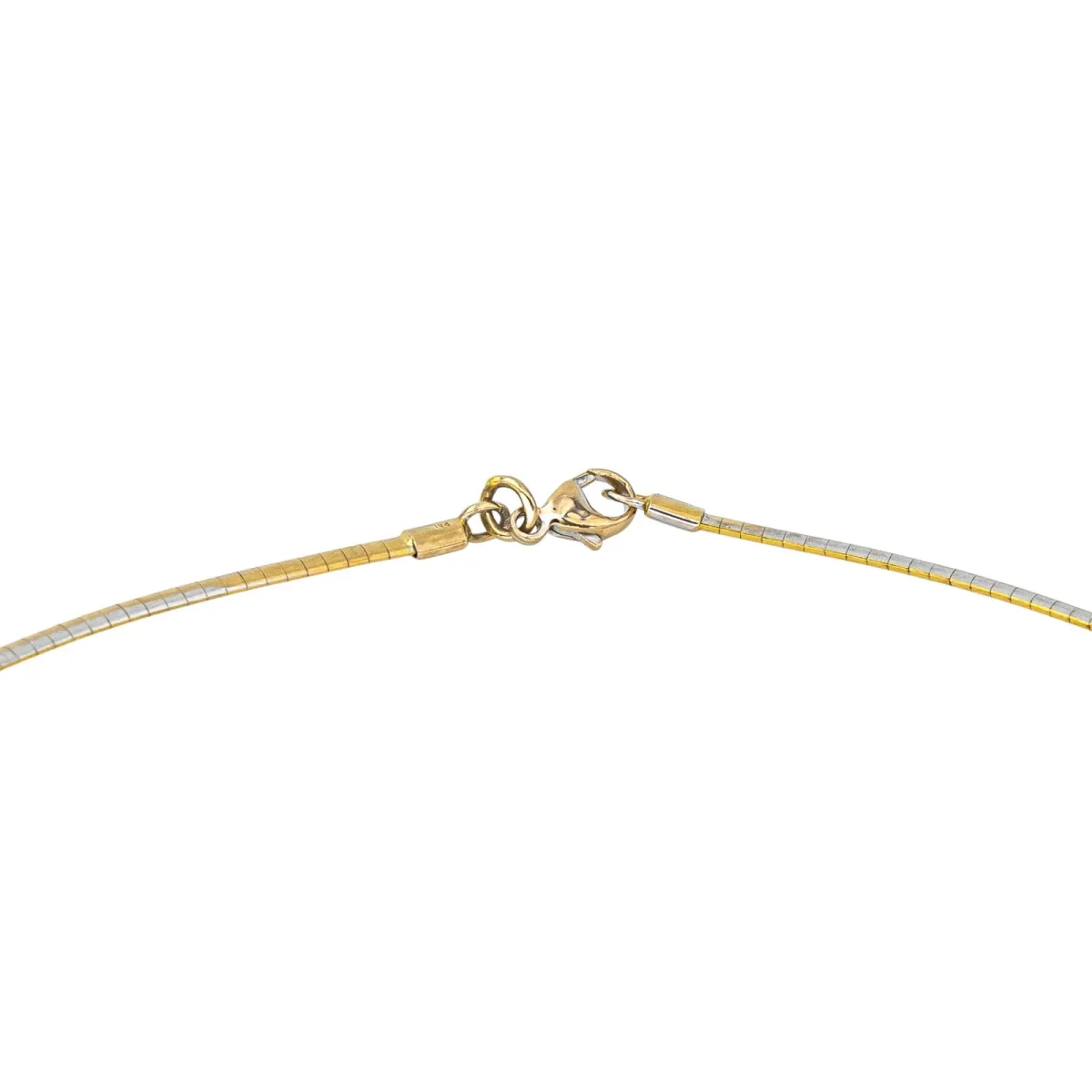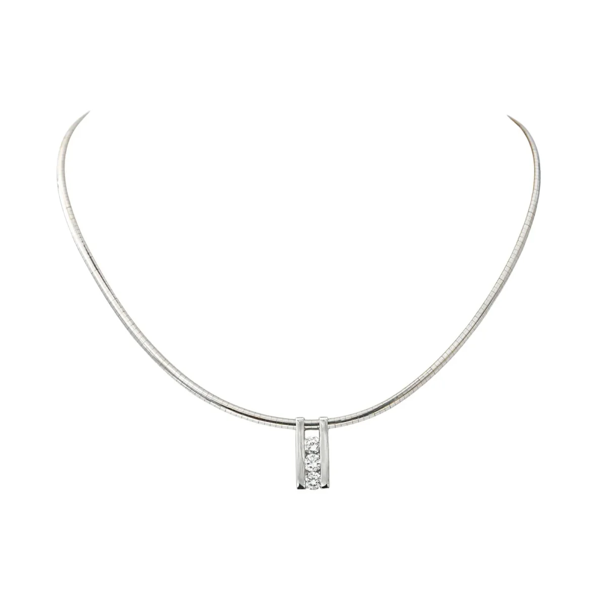 Collier en or blanc et jaune 750 millièmes (18 carats), motifs géométriques sertis de diamants, taille brillant, environ G-VS, poids total diamant : environ 0,90 ct, (chaque diamant d’un poids d’environ 0,30 ct), maille omega, longueur : 42,00 cm, largeur de la chaîne : 0,25 cm, longueur de la partie comprenant les motifs : 1,79 cm, largeur : 0,82 cm, poids total : 14,84 g, poinçon hibou, excellent état