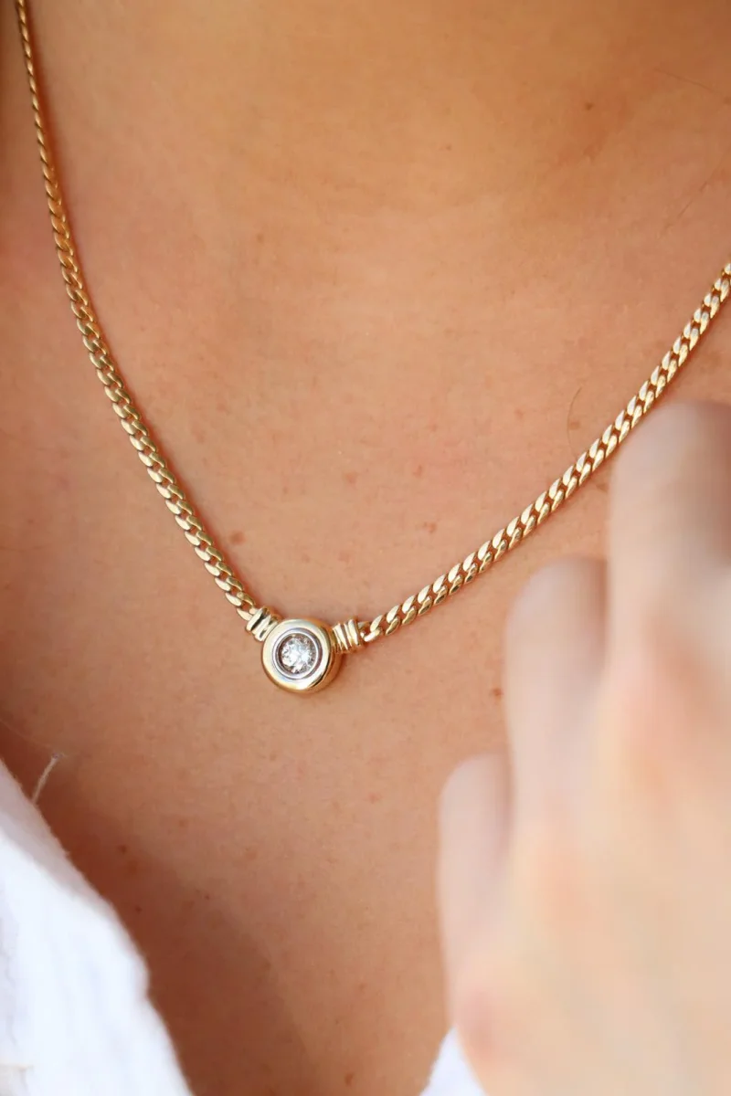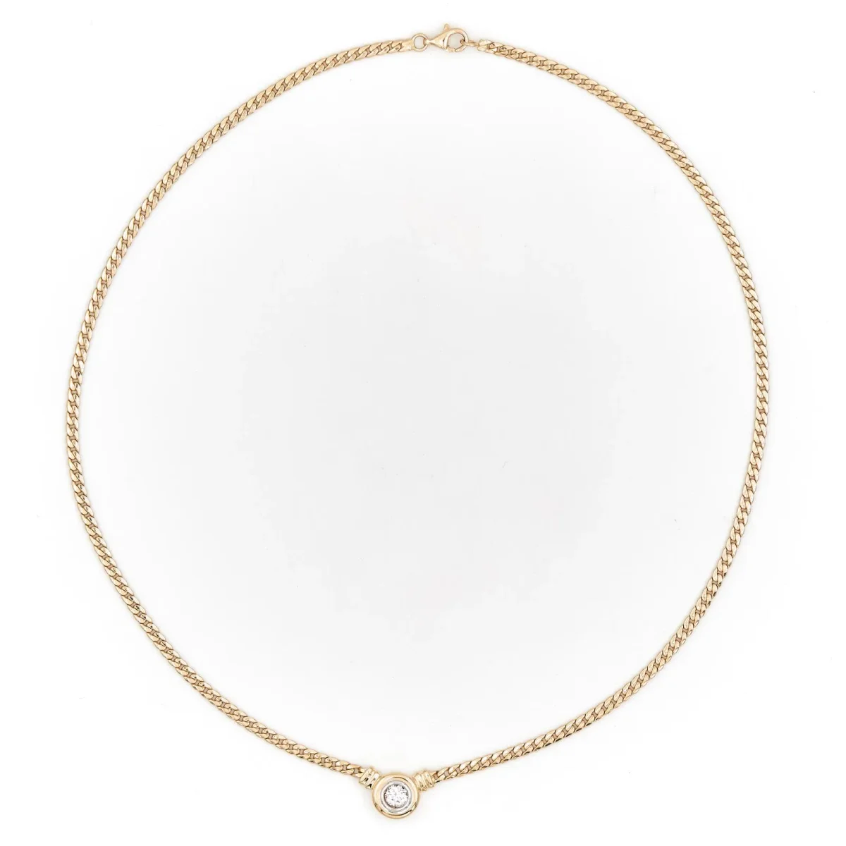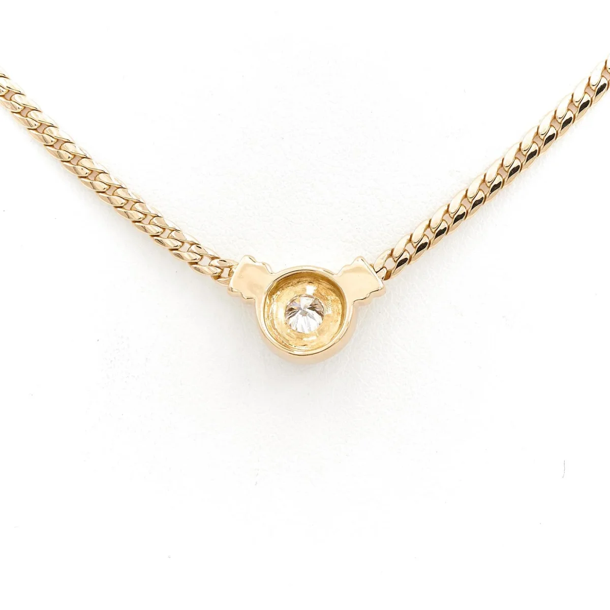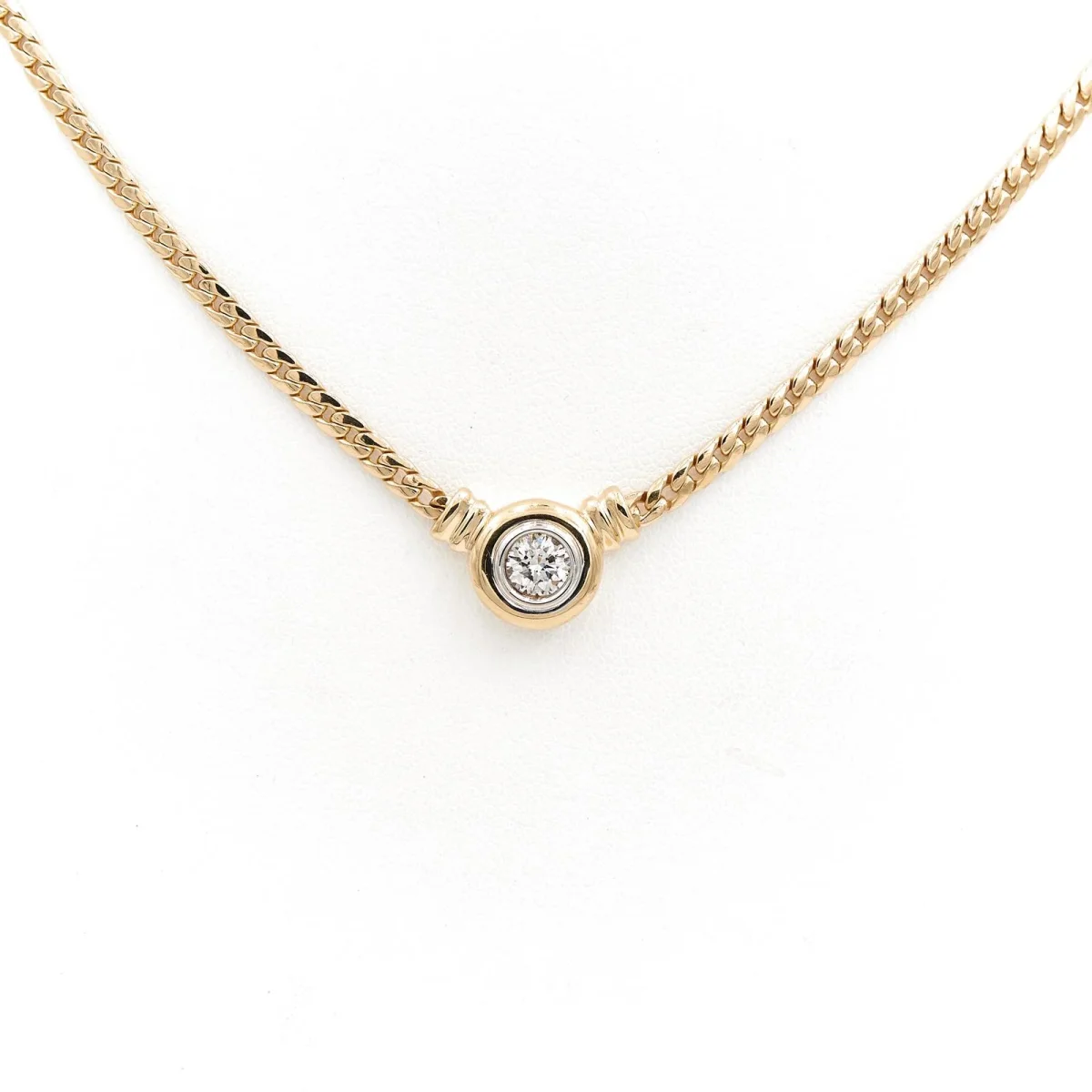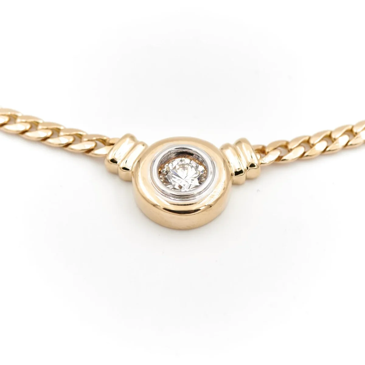 Collier en or jaune 750 millièmes (18 carats), serti d’un diamant sur or blanc, maille anglaise, 1 diamant taille brillant, envrion H-SI, d’un poids total d’environ: 0,45 ct, dimensions du motif: 1,53 cm X 1,04 cm, longueur chaine: 45 cm, largeur chaine: 0,27 cm, poids total: 14,97 g, poinçon tête d’aigle, excellent état