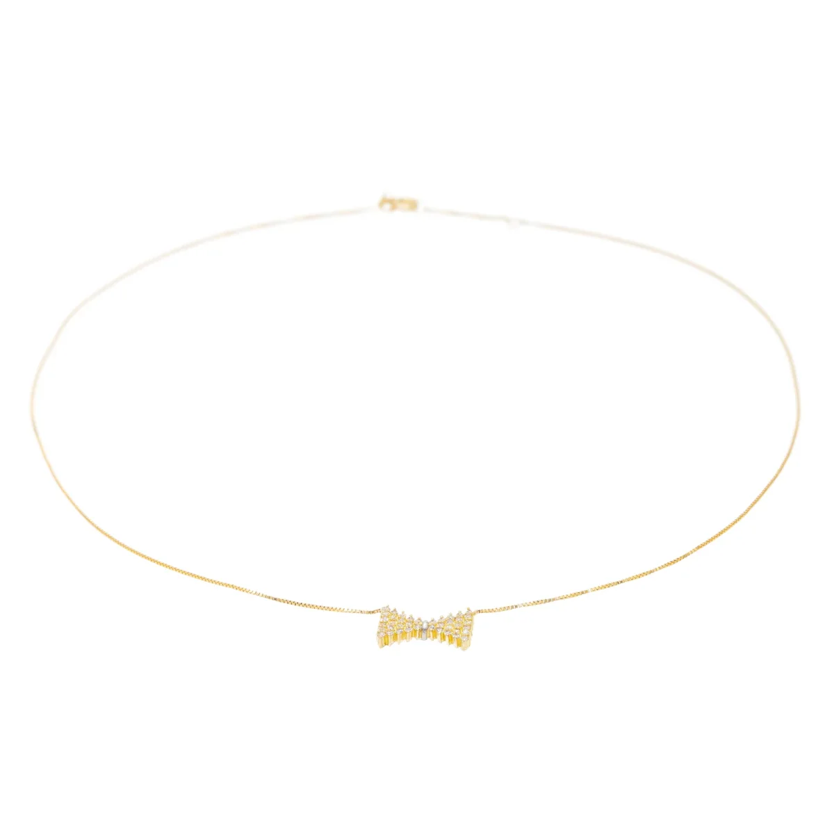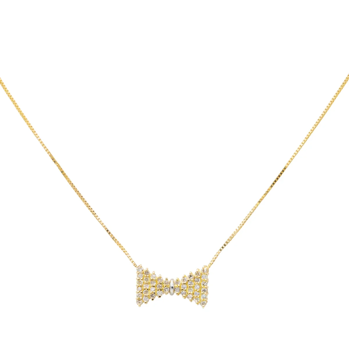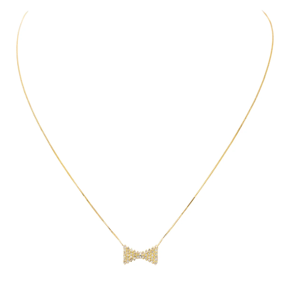 Collier pendentif noeud en or jaune et or blanc 750 millièmes (18 carats) testé, maille vénitienne, serti de 40 diamants taille huit/huit, estimés H/SI, chacun d’un poids d’environ 0,005 ct, poids total des diamants: environ 0,20 ct, longueur: 41,5 cm, dimensions du motif: 0,85 cm x 1,43 cm, poids total: 2,57 g, fermoir mousqueton, excellent état