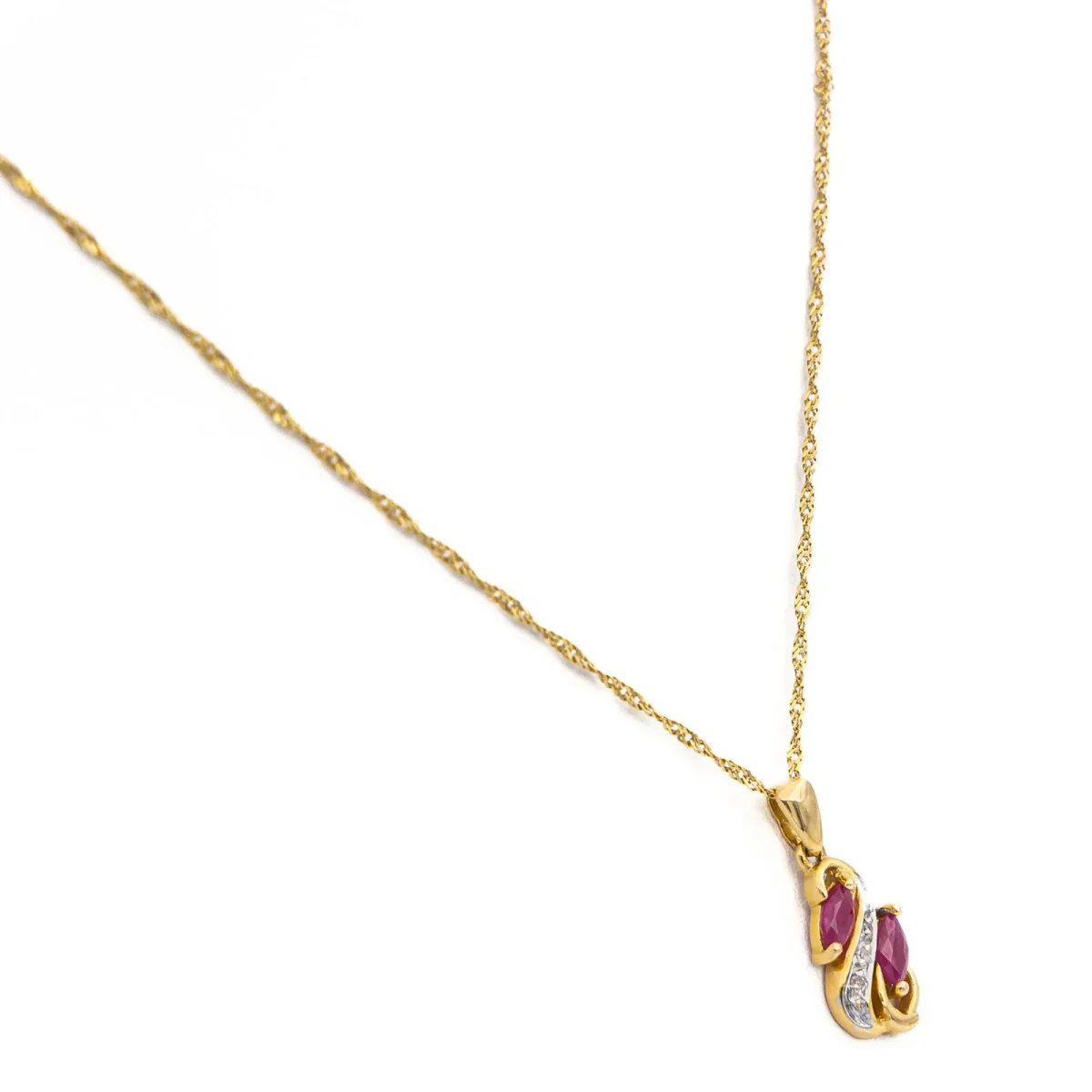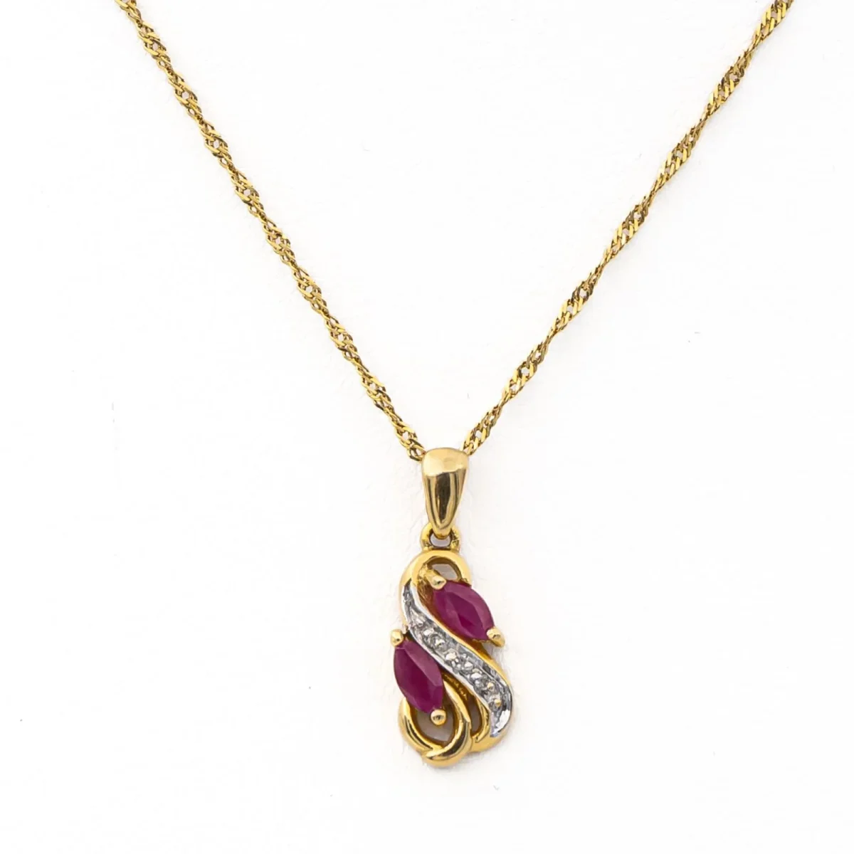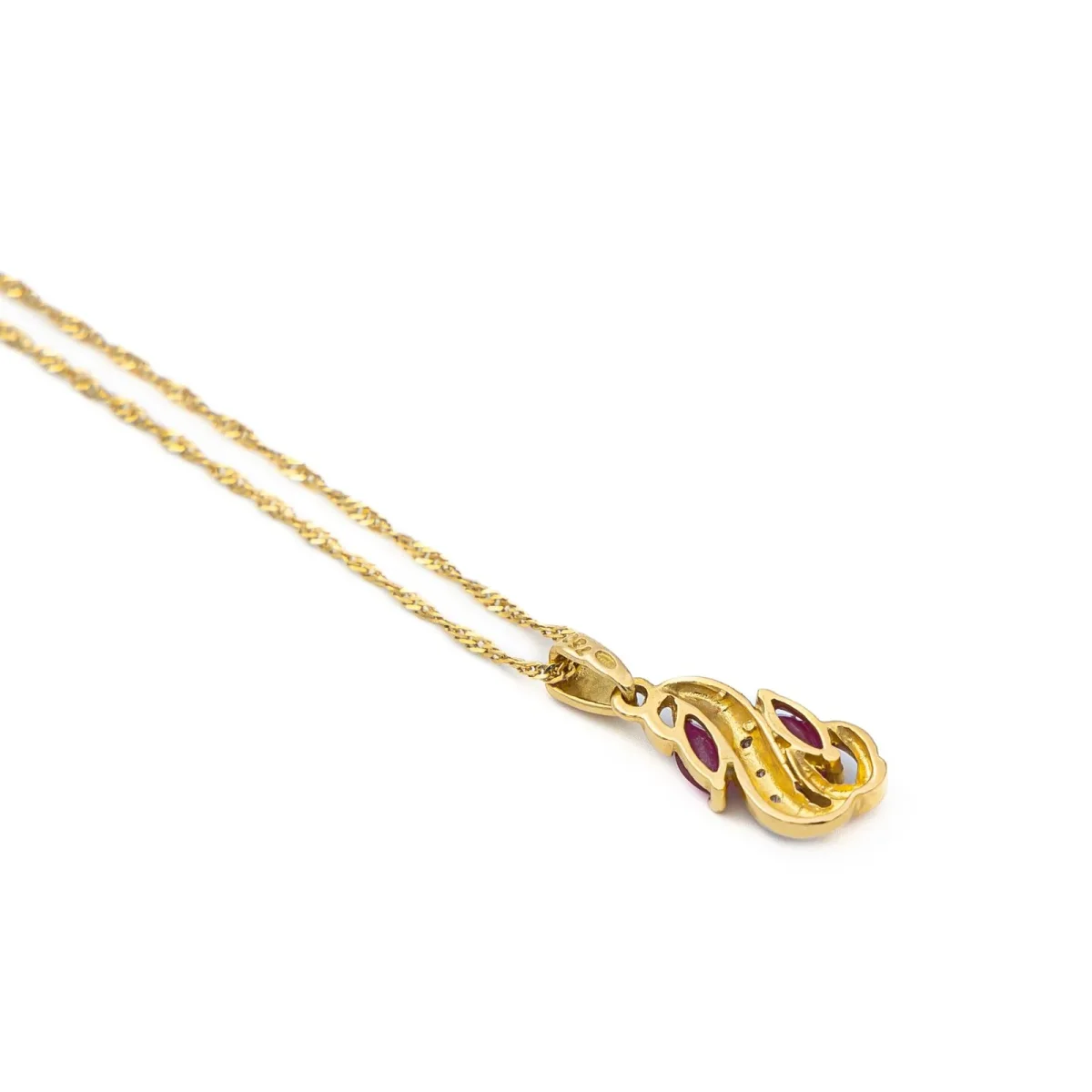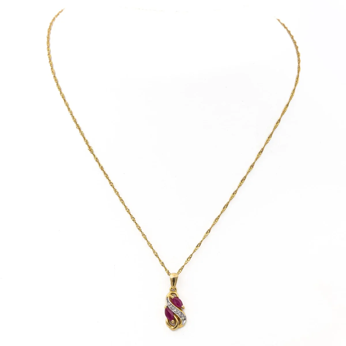 Chaine et pendentif en or jaune 750 millièmes (18 carats) testé, maille torsadée, pendentif serti de 2 rubis taille marquise, environ 0,13 ct chacune, et de 3 diamants taille brillant, environ 0,01 ct chacun et estimés G/VS, Longueur de la chaîne: 48 cm, Dimensions pendentif: 1,85 x 0,68 cm, Poids total: 2,55 g, Excellent état