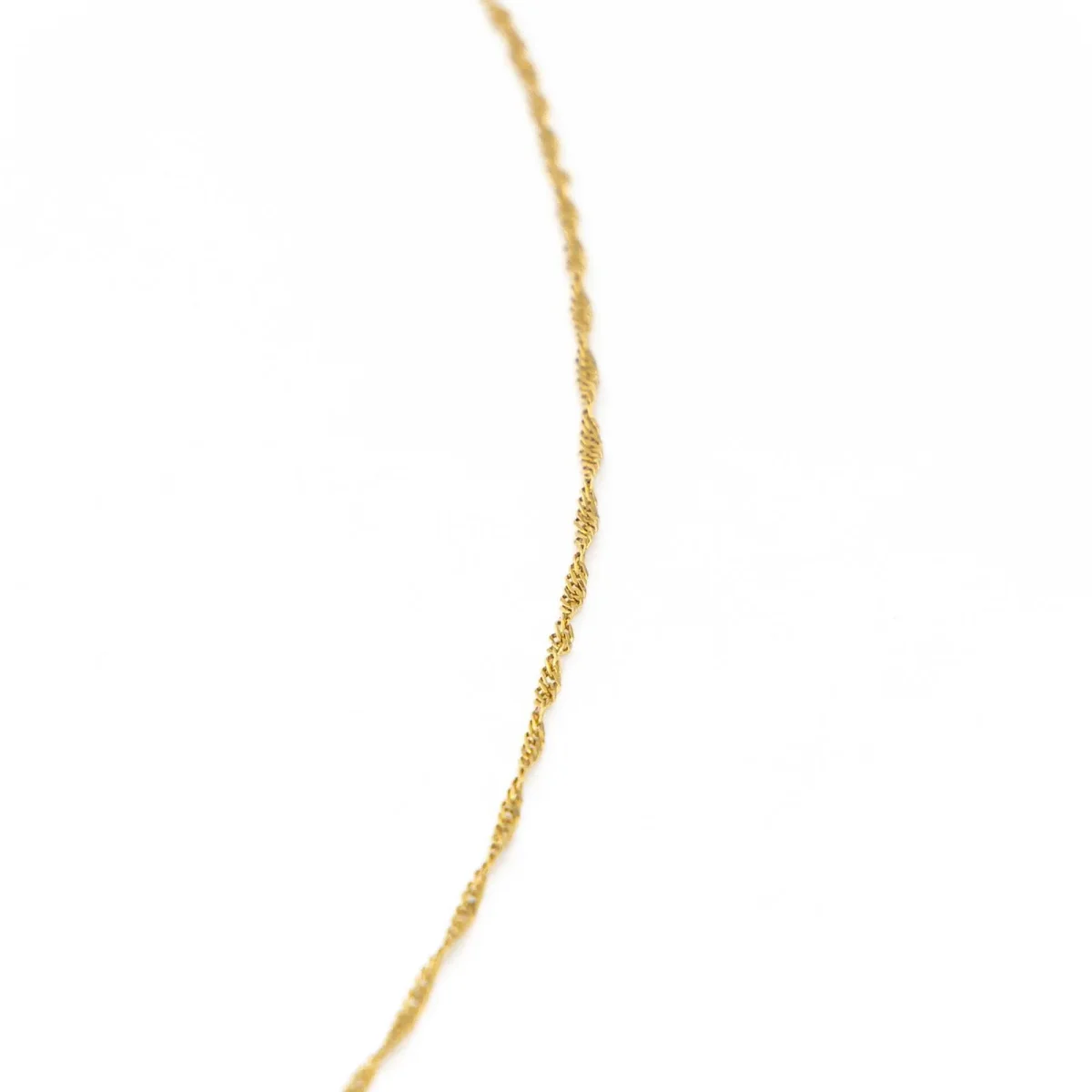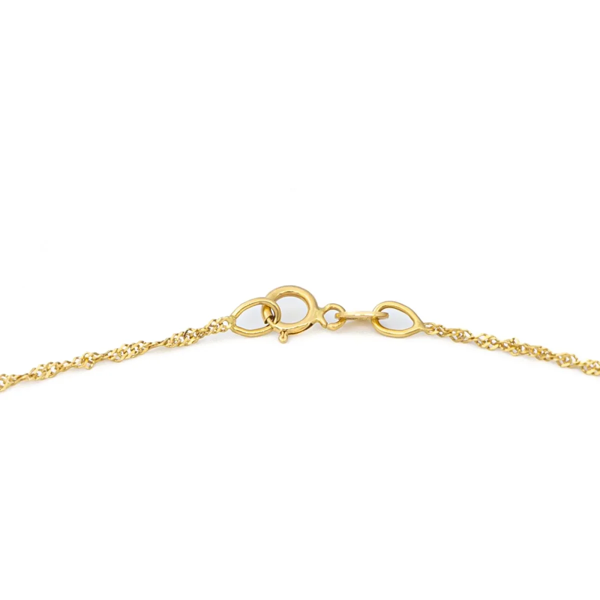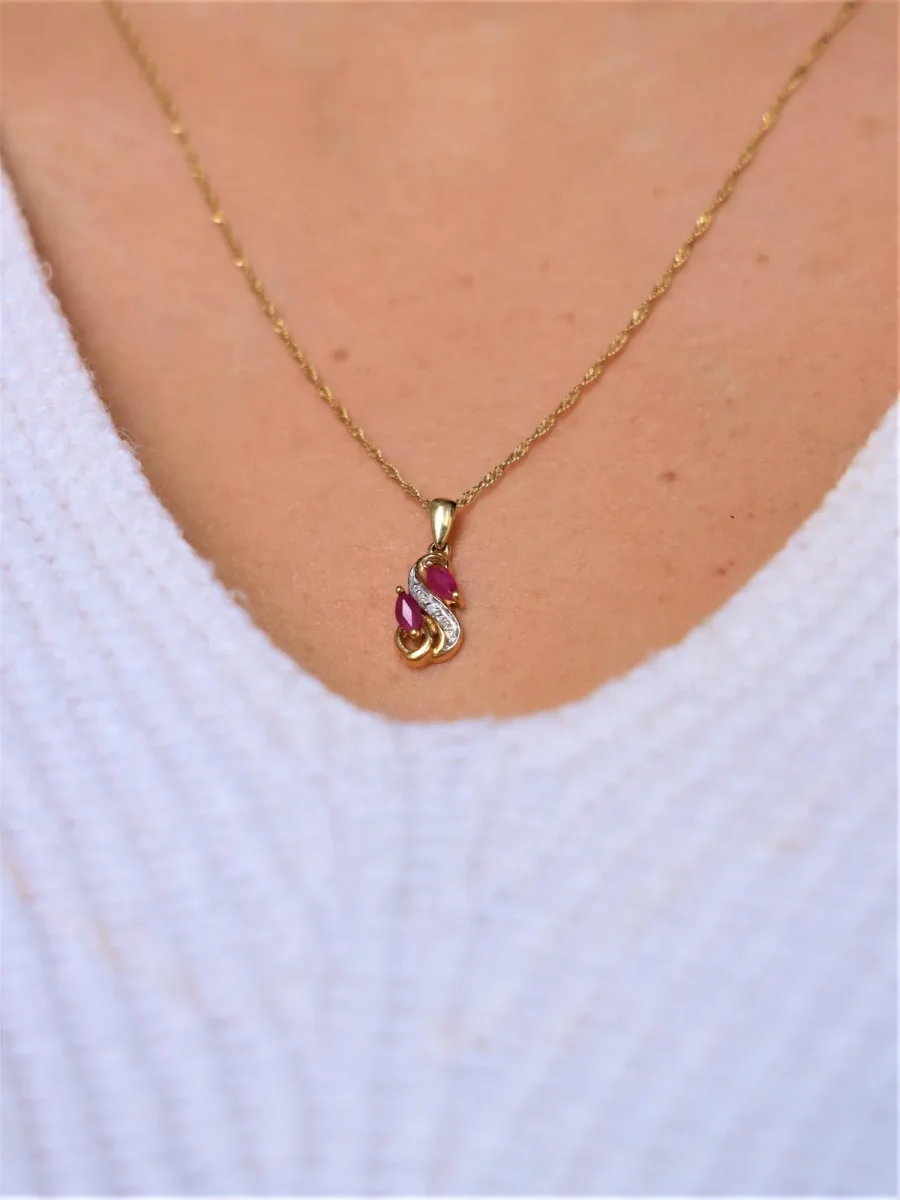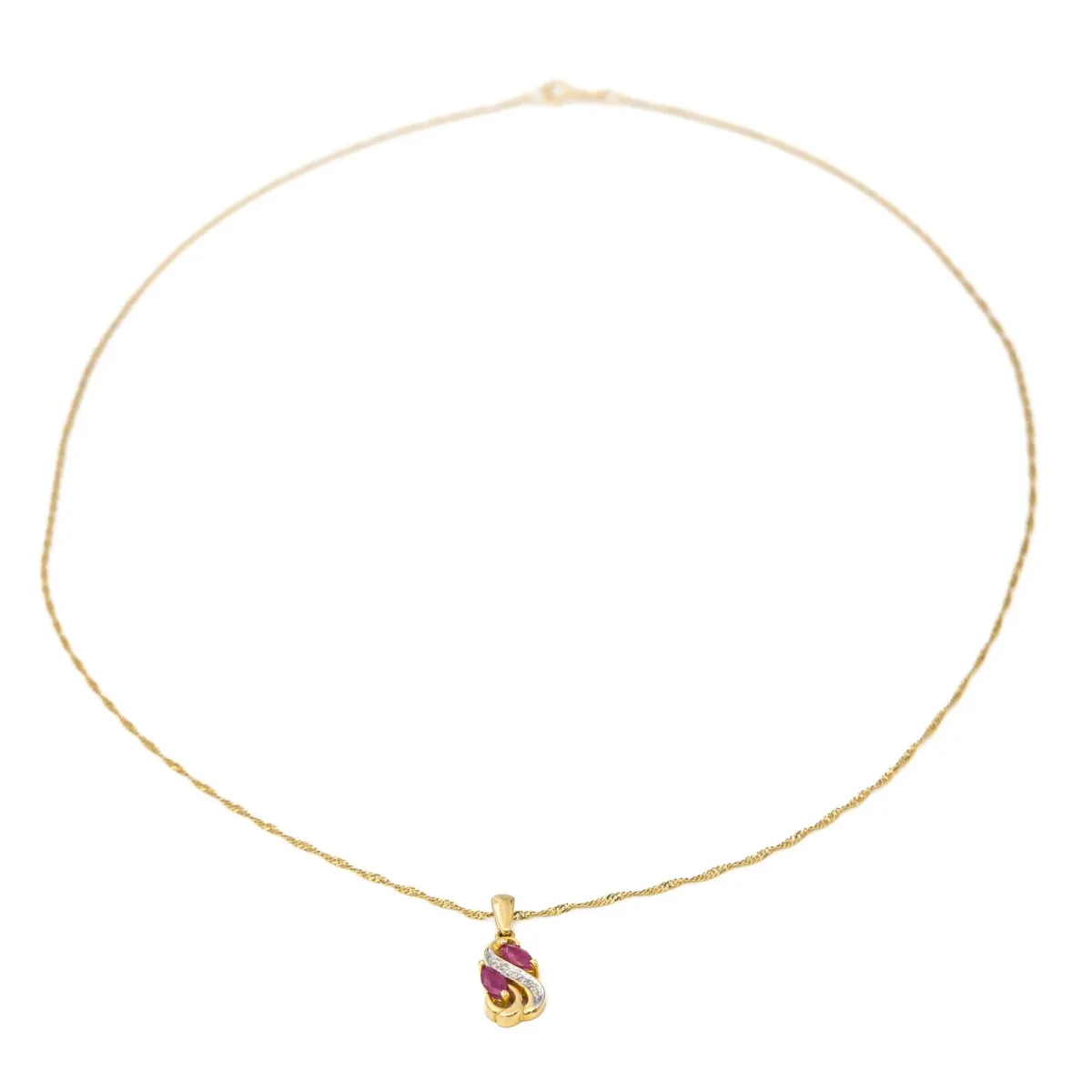 Chaine et pendentif en or jaune 750 millièmes (18 carats) testé, maille torsadée, pendentif serti de 2 rubis taille marquise, environ 0,13 ct chacune, et de 3 diamants taille brillant, environ 0,01 ct chacun et estimés G/VS, Longueur de la chaîne: 48 cm, Dimensions pendentif: 1,85 x 0,68 cm, Poids total: 2,55 g, Excellent état