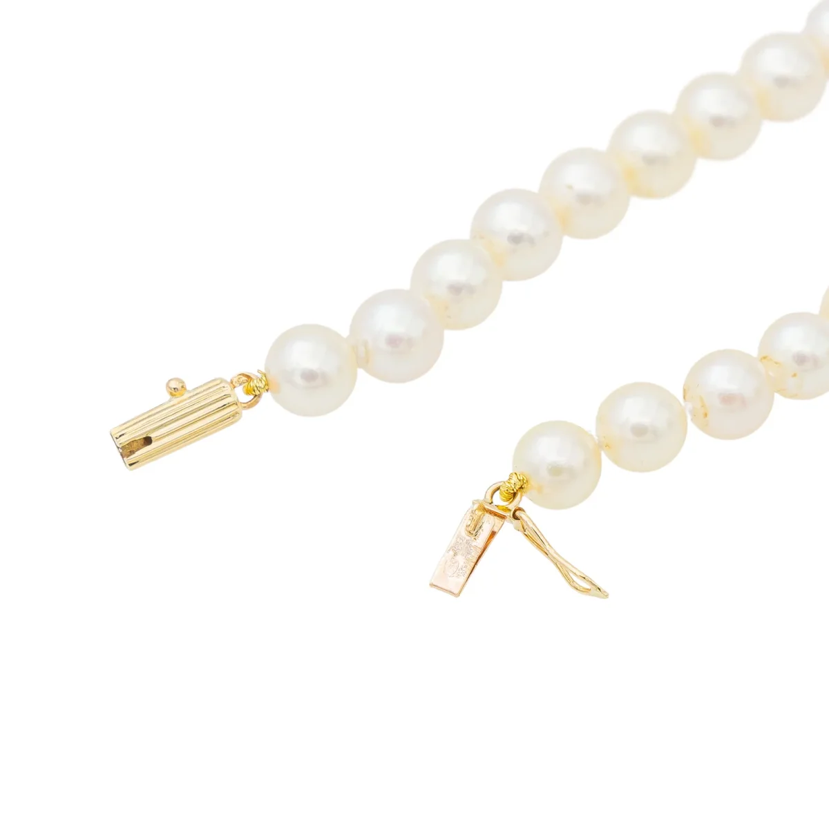 Collier de perles de culture, pendentif en or jaune 750 millièmes (18 carats), 64 perles blanches, diamètre des perles: 6,4 mm, 1 saphir taille ovale d’environ 0,33 ct, entouré de 21 diamants taille brillant, environ H-SI (chaque diamant d’un poids d’environ 0,01 ct) poids total des diamants: 0,21 ct, longueur: 42 cm, poids total: 26,68 g, poinçon hibou, Excellent état