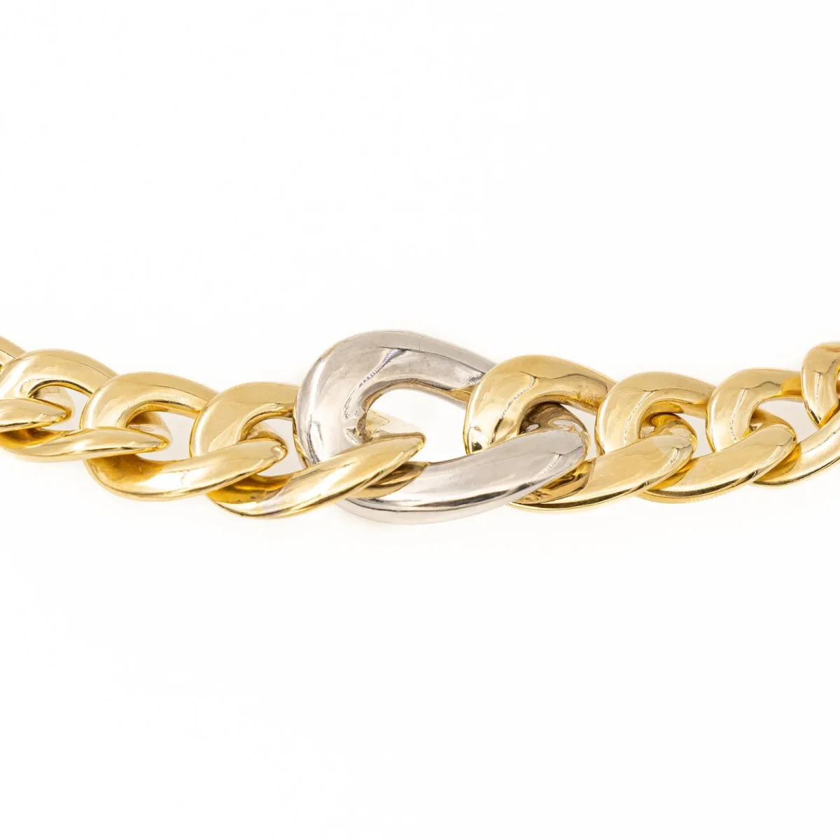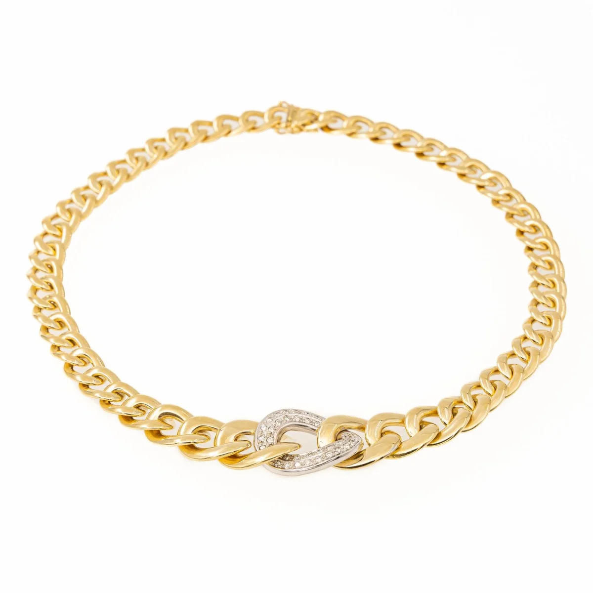 Collier en or jaune 750 millièmes (18 carats) en chute, maille gourmette épaisse, dimensions d’un petit maillon : 1.27 x 0.98 cm, épaisseur de la maille : 0.27 cm, dimension du maillon central : 2.42 x 1.90 cm, 38 diamants d’environ 0.02 ct chacun, environ H-SI, poids total diamants : 0.72 ct, longueur du collier : 40 cm, poids total : 50,69 g, poinçon hibou, excellent état