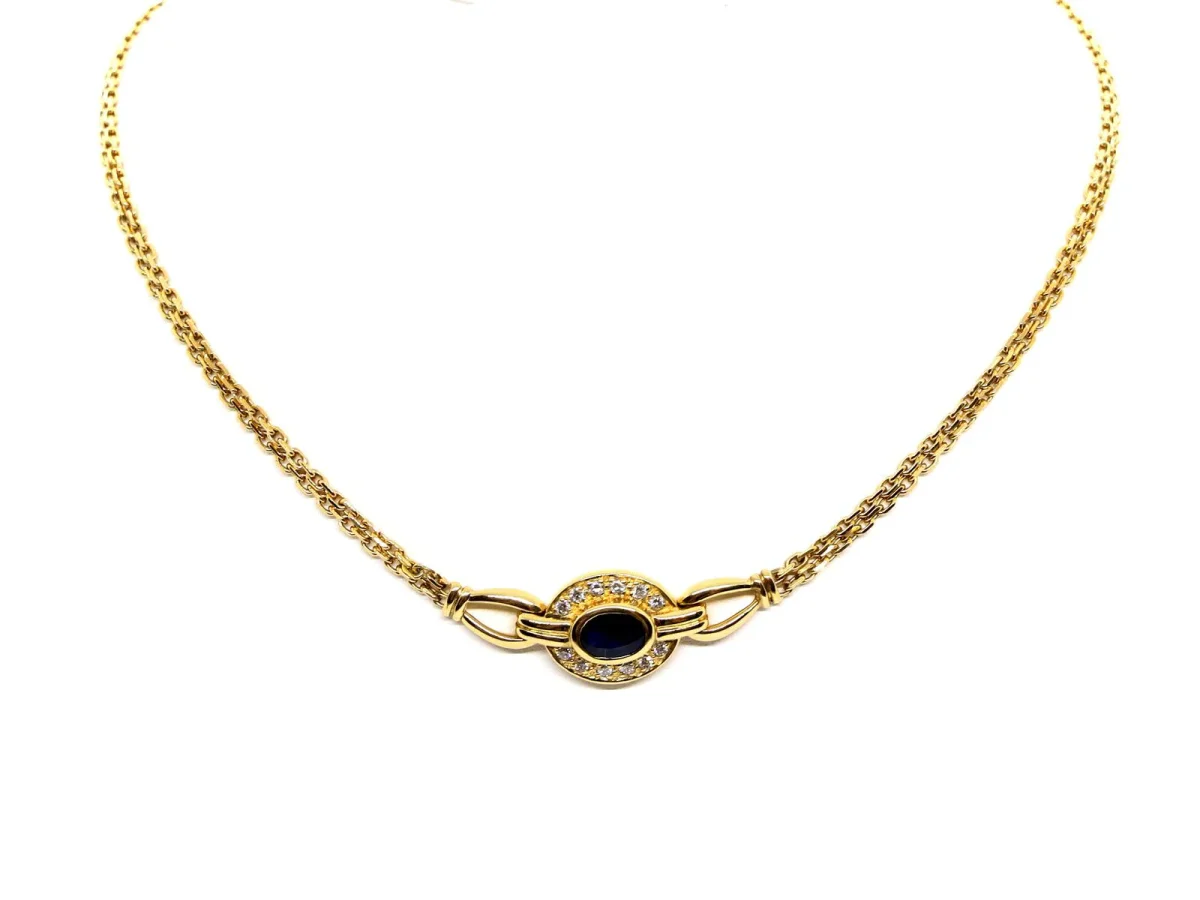 Collier ras de cou en or jaune 750 millièmes (18 carats), orné d’un saphir et de diamants, 2 chaines maille forçat retenant un pendentif, orné d’un saphir bleu taille ovale d’environ 1,10 cts, entouré de 12 diamants environ G-VS, chaque diamant d’environ 0,02 ct, poids total diamants: environ 0,24 ct, dimensions du pendentif: 1,39 cm x 3,89 cm, longueur: 39 cm, largeur d’une chaine: 0,18 cm, poids total: 17,42 g, poinçon hibou, excellent état